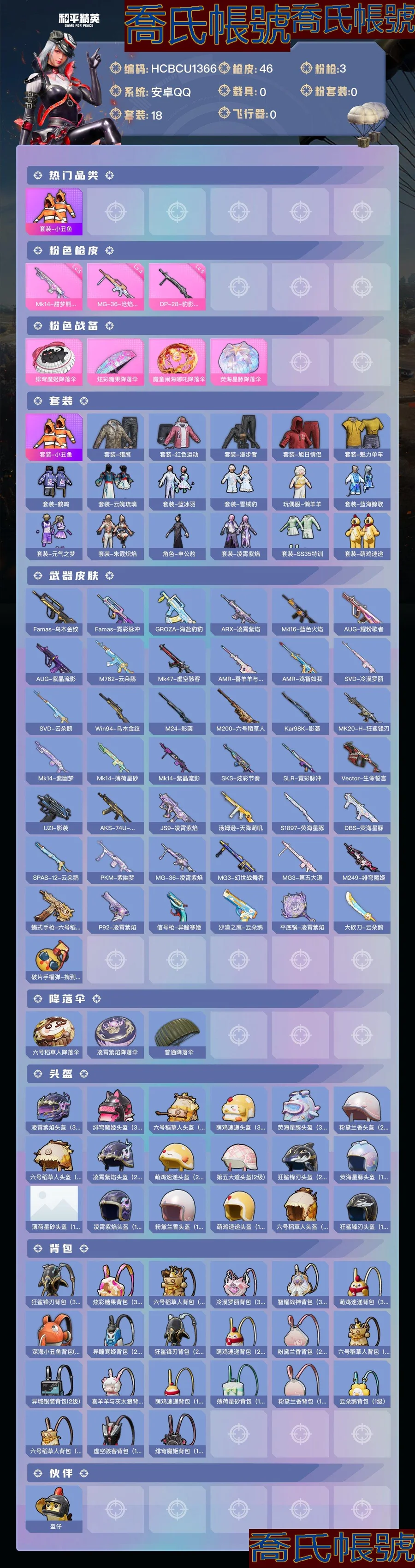 【OBHCBCU136642】熱力值:9978,3粉槍,4粉色戰備,18套裝,46槍械,43裝備,7降落傘;等級:Lv.19 歷史最高段位:堅韌鉑金Ⅳ 當前段位:英勇.黃金Ⅱ;; 【熱門品類】:套裝-小丑魚;【粉色槍械】:Mk14-甜夢熊擊[5級],MG-36-滄焰雙生[4級],DP-28-豹影疾電[5級];【粉色降落傘】:緋穹魔姬降落傘,炫彩糖果降落傘,魔童鬧海哪吒降落傘,熒海星豚降落傘;【其他套裝】:套裝-獵鷹,套裝-紅色運動,套裝-漫步者,套裝-旭日情侶,套裝-魅力單車,套裝-鶴鳴,套裝-雲魄琉璃,套裝-藍冰羽,套裝-雪絨豹,玩偶服-懶羊羊,套裝-藍海鯨歌,套裝-元氣之夢,套裝-朱霞熾焰,角色-申公豹,套裝-凌霄紫焰,套裝-SS35特訓,套裝-萌雞速遞;其他槍械:Famas-烏木金紋,Famas-霓彩脈衝,GROZA-海鹽豹豹,ARX-凌霄紫焰,M416-藍色火焰,AUG-耀粉歌者,AUG-紫晶流影,M762-雲朵鵝,Mk47-虛空駭客,AMR-喜羊羊與灰太狼,AMR-雞智如我,SVD-冷漠羅麗,SVD-雲朵鵝,Win94-烏木金紋,M24-影襲,M200-六號稻草人,Kar98K-影襲,MK20-H-狂鯊鋒刃,Mk14-紫幽夢,Mk14-薄荷星砂,Mk14-紫晶流影,SKS-炫彩節奏,SLR-霓彩脈衝,Vector-生命誓言,UZI-影襲,AKS-74U-烏木金紋,JS9-凌霄紫焰,湯姆遜-天降萌嘰,S1897-熒海星豚,DBS-熒海星豚,SPAS-12-雲朵鵝,PKM-紫幽夢,MG-36-凌霄紫焰,MG3-幻世戰舞者,MG3-第五大道,M249-緋穹魔姬,蠍式手槍-六號稻草人,P92-凌霄紫焰,信號槍-異瞳寒姬,沙漠之鷹-雲朵鵝,平底鍋-凌霄紫焰,大砍刀-雲朵鵝,破片手榴彈-拽到爆炸;【其他降落傘】:六號稻草人降落傘,凌霄紫焰降落傘,普通降落傘;【夥伴】:夥伴-盔仔,【實際資訊請以最終驗號結果為準】