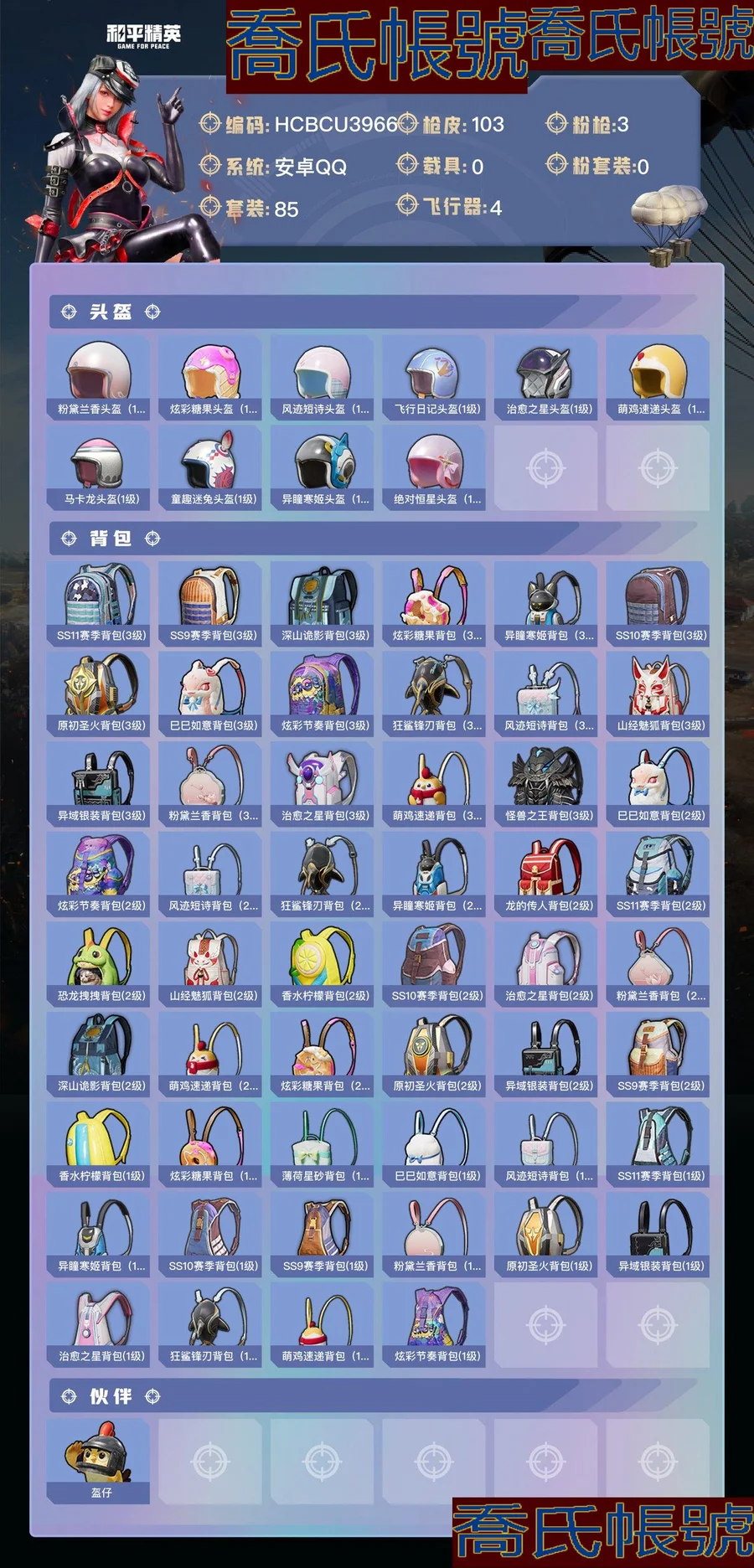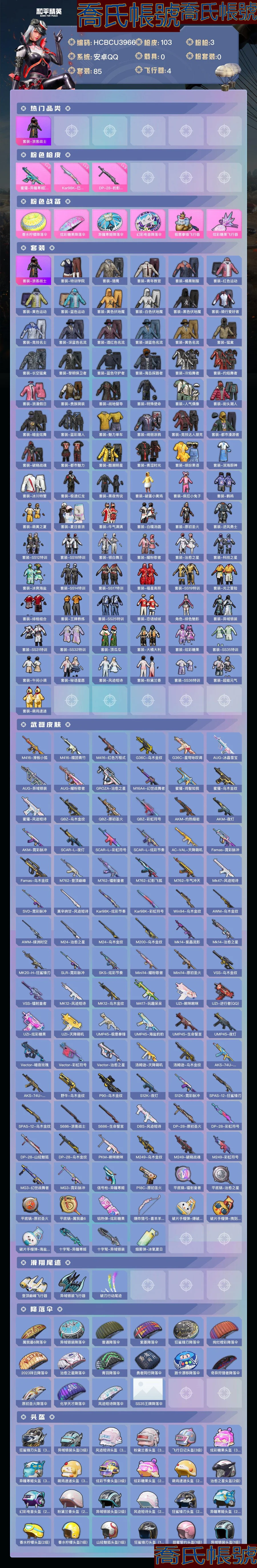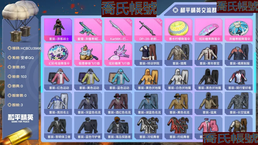 【OBHCBCU396642】熱力值:28612,3粉槍,6粉色戰備,85套裝,103槍械,98裝備,5滑翔尾翼,20降落傘;等級:Lv.53 歷史最高段位:超級王牌7星 當前段位:榮耀.皇冠Ⅴ;王牌印記1次; 【熱門品類】:套裝-浪客戰士;【粉色槍械】:蜜獾-異瞳寒姬[6級],Kar98K-巳巳如意[5級],DP-28-豹影疾電[5級];【粉色滑翔尾翼】:極意拳鋒飛行器,炫彩糖果飛行器;【粉色降落傘】:香水檸檬降落傘,炫彩糖果降落傘,異瞳寒姬降落傘,幻彩電音降落傘;【其他套裝】:套裝-特訓學院,套裝-獵鷹,套裝-青年教官,套裝-橘黑制服,套裝-紅色運動,套裝-黃色運動,套裝-藍色運動,套裝-黃色伏地魔,套裝-白色伏地魔,套裝-黑色伏地魔,套裝-騎行愛好者,套裝-競技名士,套裝-深藍色名流,套裝-酒紅色名流,套裝-湖藍色名流,套裝-黃色名流,套裝-猛禽,套裝-長空猛禽,套裝-黎明保衛者,套裝-藍色守護者,套裝-海島探路者,套裝-冷焰舞者,套裝-灼焰舞者,套裝-浪漫假日,套裝-貴族騎裝,套裝-戰地督導,套裝-特殊使命,套裝-人氣偶像,套裝-街頭潮人,套裝-暗金炫舞,套裝-藍彩潮人,套裝-魅力單車,套裝-綺麗塗鴉,套裝-競技達人朋克,套裝-都市漫遊者,套裝-破曉戰魂,套裝-都市魅力,套裝-酷潮明星,套裝-青澀時光,套裝-繽紛果語,套裝-濱海廚神,套裝-冰川特警,套裝-極速紅龍,套裝-黑夜傳說,套裝-破蛋小黃雞,套裝-瘋狂小兔子,套裝-鶴鳴,套裝-萌黃之夏,套裝-夏日音浪,套裝-牛氣滿滿,套裝-白糯湯圓,套裝-原初聖火,套裝-逆風勇士,套裝-SS12特訓,套裝-SS18特訓,套裝-銀白舞王,套裝-耀粉歌者,套裝-治癒之星,套裝-科技之星,套裝-冰爽海鹽,套裝-SS14特訓,套裝-SS17特訓,套裝-福星高照,套裝-SS19特訓,套裝-光之冒險,套裝-緋格組合,套裝-王牌教練,套裝-SS25特訓,套裝-戀語絨絨,角色-緋色魅影,套裝-異域銀裝,套裝-SS31特訓,套裝-SS32特訓,套裝-頂瓜瓜,套裝-大橘大利,套裝-炫彩糖果,套裝-SS35特訓,套裝-午間小調,套裝-秘語星願,套裝-風跡短詩,套裝-粉黛蘭香,套裝-SS36特訓,套裝-超能元氣,套裝-萌雞速遞;其他槍械:M416-滑板小狐,M416-糯團青竹,M416-紅色方程式,G36C-烏木金紋,G36C-星穹詠嘆調,AUG-冰晶雪寶,AUG-異域銀裝,AUG-耀粉歌者,GROZA-治癒之星,M16A4-幻世戰舞者,蜜獾-雞智如我,蜜獾-烏木金紋,蜜獾-風跡短詩,QBZ-烏木金紋,QBZ-原初聖火,QBZ-彩虹符號,AKM-灼熱熔岩,AKM-夜燈,AKM-霓彩脈衝,SCAR-L-夜燈,SCAR-L-彩虹符號,SCAR-L-炫彩節奏,AC-VAL-天降萌嘰,Famas-霓彩脈衝,Famas-烏木金紋,M762-登頂巔峰,M762-鐳射皇者,M762-幻影飛狐,M762-牛氣沖天,Mk47-風跡短詩,SVD-霓彩脈衝,莫辛納甘-風跡短詩,Kar98K-炫彩節奏,Kar98K-彩虹符號,Win94-烏木金紋,AWM-烏木金紋,AWM-綠洲時空,M24-治癒之星,M24-烏木金紋,M200-烏木金紋,Mk14-紫晶流影,Mk14-治癒之星,MK20-H-狂鯊鋒刃,SLR-霓彩脈衝,SKS-炫彩節奏,Mini14-耀粉歌者,Mini14-原初聖火,VSS-烏木金紋,VSS-鐳射皇者,MK12-風跡短詩,MK12-烏木金紋,M417-玩趣呆呆,UZI-啾咪啾咪,UZI-逆行者(QQ),UZI-炫彩糖果,UZI-天降萌嘰,UMP45-極意拳鋒,UMP45-海鹽豹豹,UMP45-生命誓言,UMP45-夜燈,Vector-暗夜玫瑰,Vector-彩虹符號,Vector-治癒之星,湯姆遜-天降萌嘰,湯姆遜-烏木金紋,AKS-74U-雞智如我,AKS-74U-烏木金紋,野牛-烏木金紋,P90-烏木金紋,S12K-夜燈,S12K-霓彩脈衝,SPAS-12-狂鯊鋒刃,SPAS-12-烏木金紋,S686-浪客戰士,S686-生命誓言,DBS-風跡短詩,DP-28-原初聖火,DP-28-彩虹符號,DP-28-山經魅狐,DP-28-烏木金紋,PKM-啾咪啾咪,M249-烏木金紋,M249-破曉戰魂,M249-彩虹符號,MG3-幻世戰舞者,MG3-霓彩脈衝,信號槍-異瞳寒姬,P18C-原初聖火,平底鍋-鐳射皇者,平底鍋-治癒之星,平底鍋-原初聖火,平底鍋-屬我最6,鋁熱彈-炫彩糖果,爆炸獵弓-喜羊羊與灰太狼,破片手榴彈-爆破雪人,破片手榴彈-拽到爆炸,破片手榴彈-海鹽豹豹,十字弩-異瞳寒姬,十字弩-異域銀裝,煙霧彈-冰氧夏日;【其他滑翔尾翼】:登頂巔峰飛行器,異域銀裝飛行器,破刃行動尾跡;【其他降落傘】:屬我最6降落傘,異域銀裝降落傘,普通降落傘,紫菱降落傘,狂鯊鋒刃降落傘,絢爛橙彩降落傘,2023祥雲降落傘,治癒之星降落傘,青羽降落傘,勇者同行降落傘,跑卡漂移降落傘,奇異狩獵者降落傘,原初聖火降落傘,化學天才降落傘,風跡短詩降落傘,SS35王牌降落傘;【夥伴】:夥伴-盔仔,【實際資訊請以最終驗號結果為準】