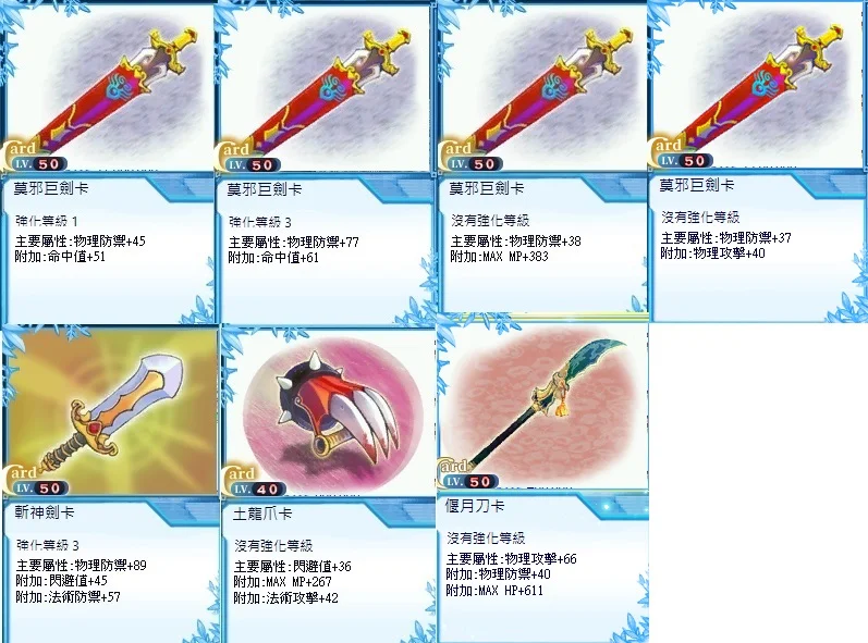 斬神劍+3/莫邪巨劍+1/偃月刀(裝備卡 物防、魔防、閃、命中)