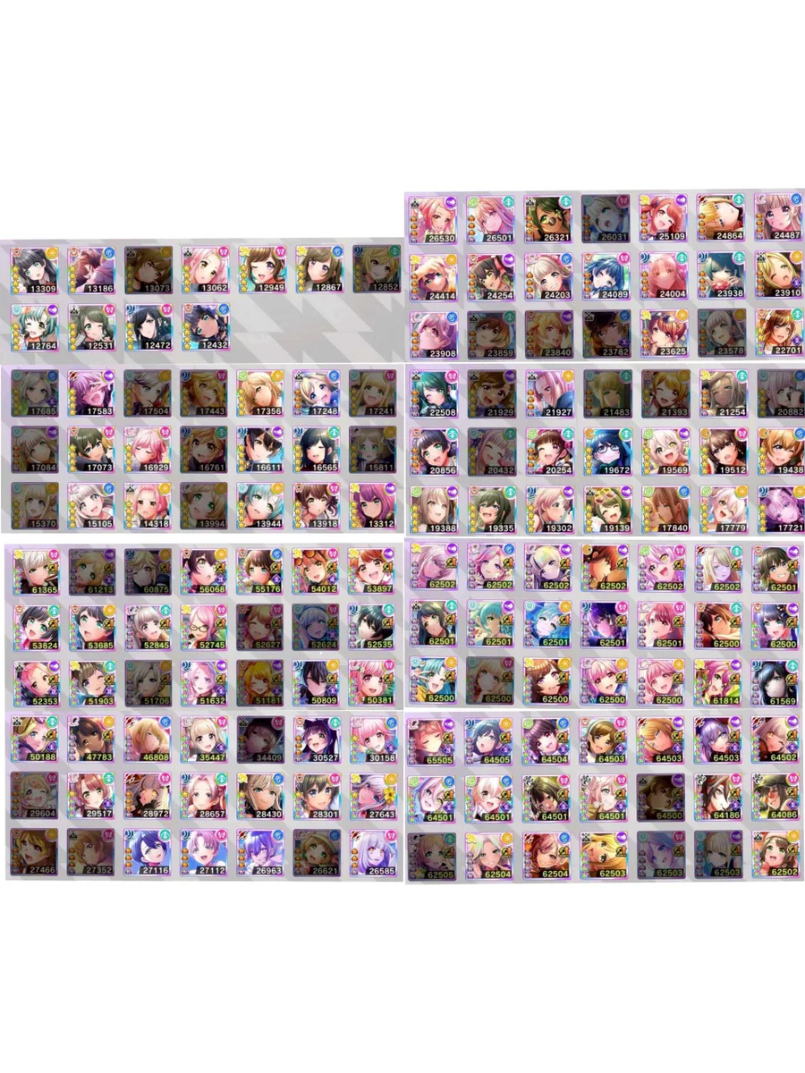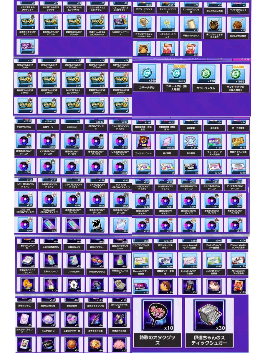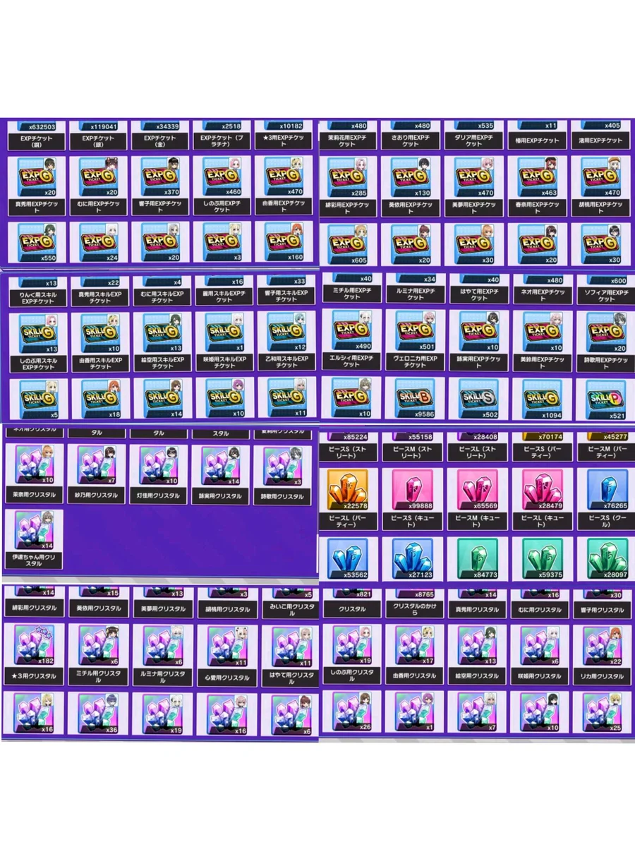 鑽石60萬多顆,可以抽3000鑽石十連抽200次;ツアー交換券有上千張,可以換很多資源;特訓アイテム引換券有875張,可以換全種類的特訓升級必需品;等級&技能升級經驗也是有很多;有一些道具會隨著我持續練帳號有所改變,但鑽石會持續增加,增加這個帳號的價值哦!