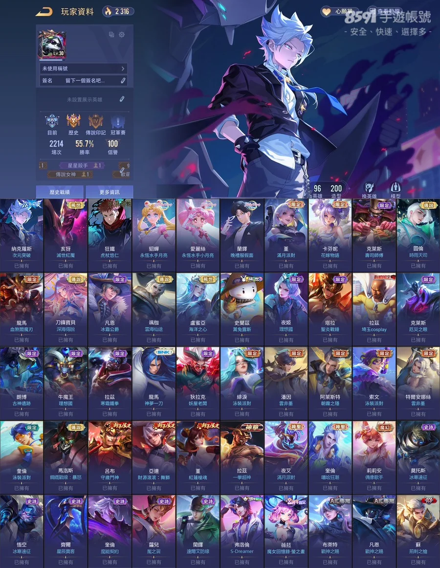 歷史璀璨傳說印記!!近百英雄兩百造型!共96英雄200造型!勝率近56%!!共4次S傳說印記!!