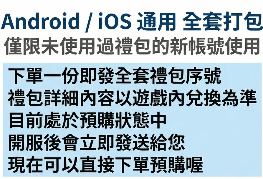 嚴重聲明:限沒用過任何禮包的新號使用,自己在哪用過買過禮包勿拍安卓IOS通用 全套打包本卡一經出售不接受我買過,我用過,我領過等等為理由,多拍錯拍概不退換,以此為據!禮包內容如圖使用方法:跟隨訂單一起發送