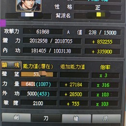 八卦:爆傷42%、武傷60%、熟攻擊4100、爆率10%、無視防禦1100、負重75000、力經驗60%、內力回復33000、聲望經驗100%、武功經驗110%...等。(持續增加)