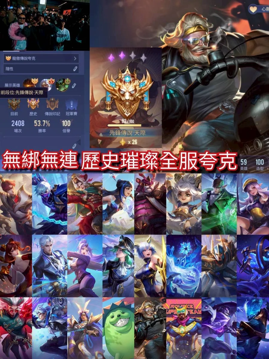 【Garena帳無綁無連、璀璨傳說、V4、59英、100造】輔助帳 歷史璀璨 全幅夸克 霸天歌德 浪客 鬼武者 跳跳糖 s2賽尼