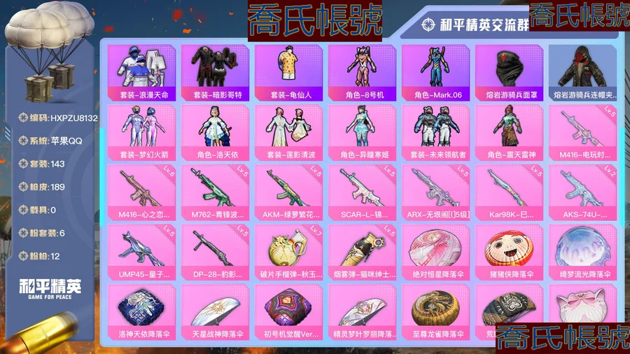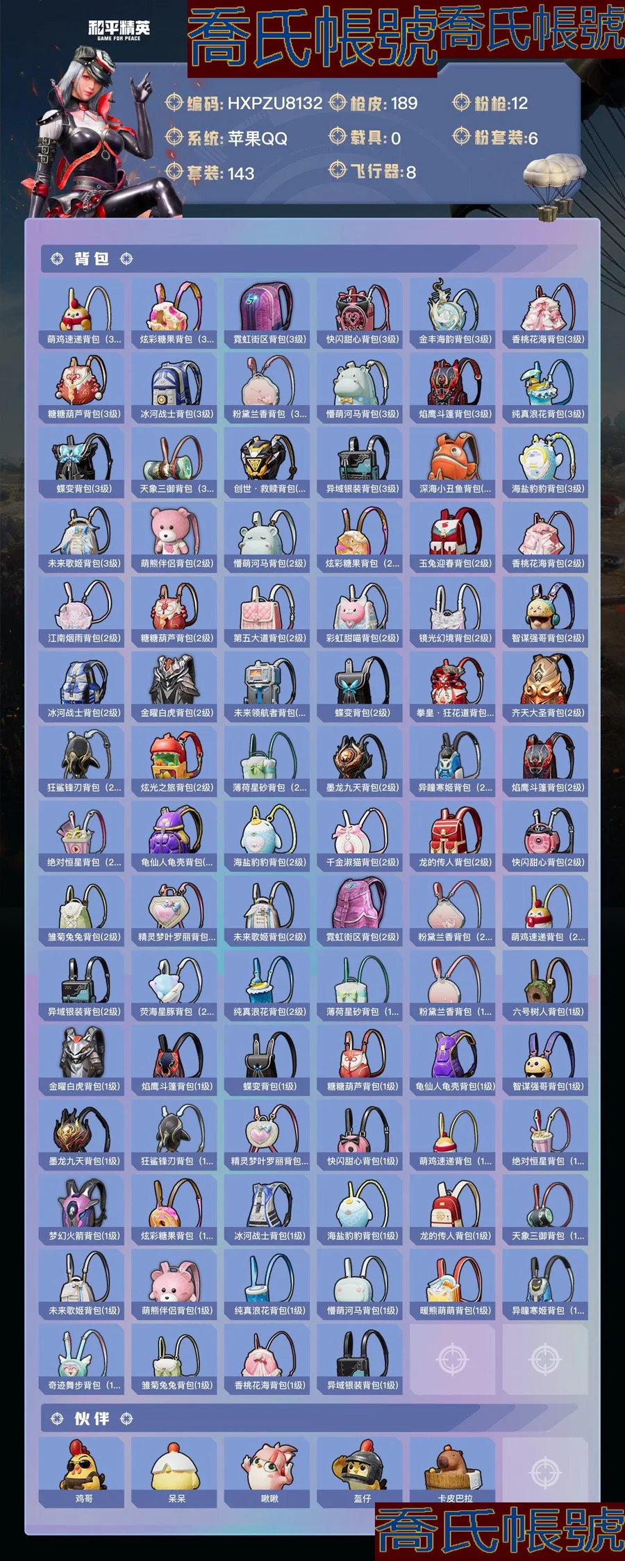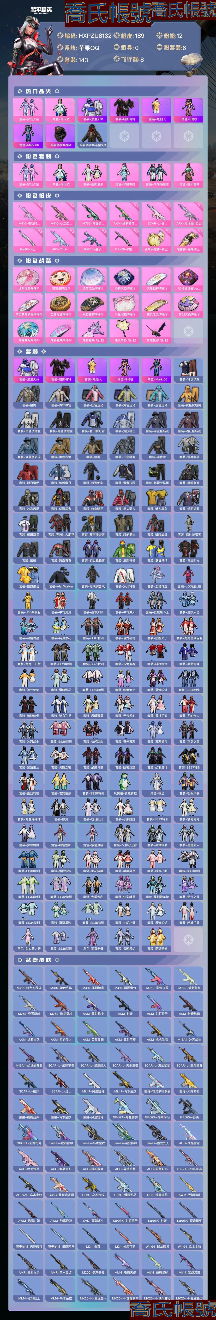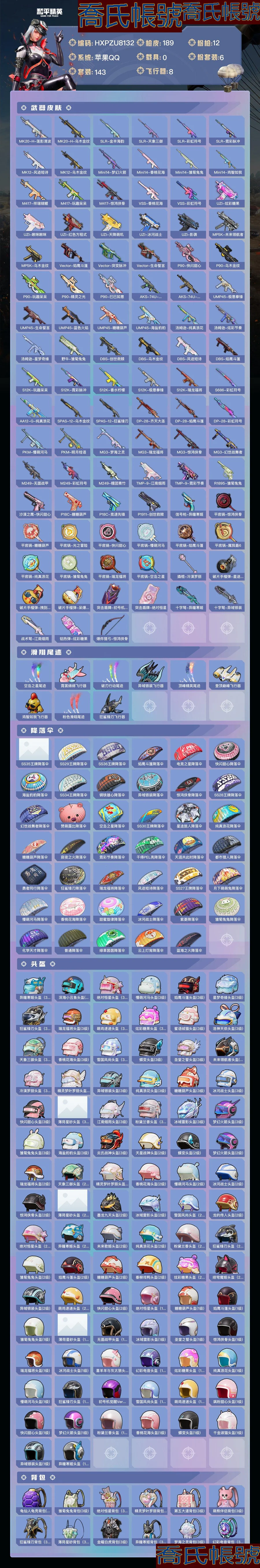 【OBHXPZU813242】熱力值:61036,6粉裝,12粉槍,17粉色戰備,143套裝,189槍械,219裝備,12滑翔尾翼,55降落傘;等級:Lv.59 歷史最高段位:超級王牌12星 當前段位:超級.王牌1星;王牌印記8次 卓越印記3次; 【熱門品類】:套裝-浪漫天命,套裝-暗影哥特,套裝-龜仙人,角色-8號機,角色-Mark.06,熔岩遊騎兵面罩,熔岩遊騎兵連帽夾克;【粉色套裝】:粉裝-夢幻火箭,角色-洛天依,粉裝-蓮影清波,角色-異瞳寒姬,粉裝-未來領航者,角色-震天雷神;【粉色槍械】:M416-電玩時刻[5級],M416-心之戀語[6級],M762-青鋒波束[5級],AKM-綠蘿繁花[5級],SCAR-L-錦繡綿綿[5級],ARX-無垠閣[5級],Kar98K-巳巳如意[5級],AKS-74U-無垠閣[2級],UMP45-量子極限[5級],DP-28-豹影疾電[5級],破片手榴彈-秋玉花燈[7級],煙霧彈-貓咪紳士[5級];【粉色滑翔尾翼】:炫彩糖果飛行器,曦光華影飛行器,繁龍極客飛行器;【粉色降落傘】:絕對恆星降落傘,豬豬俠降落傘,綺夢流光降落傘,洛神天依降落傘,天星戰神降落傘,初號機覺醒Ver.降落傘,精靈夢葉羅麗降落傘,至尊龍雀降落傘,荒野獵神降落傘,千金淑貓降落傘,精靈之光降落傘,夢幻火箭降落傘,異瞳寒姬降落傘,炫彩糖果降落傘;【其他套裝】:套裝-特訓學院,套裝-獵鷹,套裝-青年教官,套裝-紅色運動,套裝-黃色運動,套裝-藍色運動,套裝-黃色伏地魔,套裝-白色伏地魔,套裝-黑色伏地魔,套裝-登山愛好者,套裝-競技名士,套裝-深藍色名流,套裝-酒紅色名流,套裝-湖藍色名流,套裝-黃色名流,套裝-猛禽,套裝-長空猛禽,套裝-漫步者,套裝-雪鷹學院,套裝-旭日情侶,套裝-繽紛假日,套裝-特殊使命,套裝-青春校園,套裝-燃燒卡路里,套裝-鷹眼刺客,套裝-冰凍風暴,套裝-幻影武者,套裝-熱血騎手,套裝-街頭潮人,套裝-魅力單車,套裝-綺麗塗鴉,套裝-耀眼新星,套裝-競技達人朋克,套裝-都市漫遊者,套裝-超能勇士,套裝-破曉戰魂,套裝-森林遊獵者,套裝-榮耀,套裝-熱血青春,套裝-幻世戰舞者,套裝-清新檸檬,套裝-夏日傾情,套裝-青澀時光,套裝-繽紛果語,套裝-AlanWalker,套裝-龍魂突擊隊,套裝-冰川特警,套裝-淡雅花蕊,套裝-LGD戰隊服,套裝-JDE戰隊服,套裝-牛氣滿滿,套裝-戰術大師,套裝-牛氣沖天,套裝-競技角鬥士,套裝-曼妙人魚,套裝-熱情海星,套裝-純真浪花,套裝-SS17特訓,套裝-瑞龍福將,套裝-團圓交子,套裝-虎虎生威吉莉,套裝-兔兔白日夢,套裝-SS20特訓,套裝-SS21特訓,套裝-玉兔迎春,套裝-緋格組合,套裝-萊茵河畔,套裝-神氣柴柴,套裝-懵萌河馬,套裝-SS24特訓,套裝-絢紫流光,套裝-霓虹閃爍,套裝-SS25特訓,套裝-驚鴻俠骨,套裝-錦衣飛揚,套裝-晨曦薄霧,套裝-元氣發射,套裝-香桃花海,套裝-龍的傳人,套裝-冰河戰士,套裝-SS26特訓,套裝-快閃甜心,套裝-春光漫遊,套裝-漫遊都市,套裝-空島之星,套裝-湖泊玉蘭,套裝-貝斯之夜,套裝-焰鷹斗篷,套裝-幽夜迷蹤,套裝-幻羽潛行,套裝-SS27特訓,套裝-幽幻花璃,套裝-老實芭蕉,套裝-SS28特訓,玩偶服-賣崽青蛙,角色-銀塵,套裝-街頭風暴,套裝-海鹽綿綿冰,套裝-蝶變,套裝-粉日山川,套裝-小熊娃娃,套裝-SS29特訓,套裝-雛菊兔兔,套裝-蘿蘭蝴蝶,角色-緋色魅影,角色-紫俏靈貓,套裝-火種守衛者,套裝-異域銀裝,套裝-星途旅人,套裝-SS30特訓,套裝-青團波波,套裝-棉花軟糖,套裝-糖糖葫蘆,套裝-絨寶小鵝,套裝-SS31特訓,套裝-SS33特訓,套裝-SS32特訓,套裝-大橘大利,套裝-炫彩糖果,套裝-星影讚美詩,套裝-元氣之夢,套裝-SS34特訓,套裝-薄荷星砂,套裝-SS35特訓,套裝-午間小調,套裝-風跡短詩,套裝-粉黛蘭香,角色-甜心蒙太奇,套裝-SS36特訓,角色-紫霄電母,套裝-雪國風尚,套裝-萌雞速遞;其他槍械:M416-紅色方程式,M416-藍色火焰,M416-聖誕驚喜,M416-糯團青竹,M762-彩虹符號,M762-雛菊兔兔,M762-登頂巔峰,M762-瑞龍福將,AKM-霓彩脈衝,AKM-影襲,AKM-彩虹符號,AKM-破曉戰魂,AKM-塗鴉街區,AKM-龍的傳人,AKM-熒星靈貓,AKM-霓彩節奏,AKM-虎虎生威,M16A4-冰河戰士,M16A4-幻世戰舞者,SCAR-L-炫彩節奏,SCAR-L-星途旅人,SCAR-L-天象三御,SCAR-L-海鹽豹豹,SCAR-L-玉兔迎春,SCAR-L-夜燈,SCAR-L-紅色方程式,Mk47-風跡短詩,Mk47-烏木金紋,蜜獾-精靈夢葉羅麗,蜜獾-天降萌嘰,蜜獾-糖糖葫蘆,蜜獾-烏木金紋,蜜獾-風跡短詩,GROZA-海鹽豹豹,GROZA-懵萌河馬,GROZA-影襲,GROZA-彩虹符號,Famas-霓彩脈衝,Famas-烏木金紋,Famas-突變脈衝,Famas-墨龍九天,AUG-冰晶雪寶,AUG-絕對恆星,AUG-紫晶流影,AUG-耀粉歌者,AUG-異域銀裝,AUG-焰舞熾心,AC-VAL-快閃甜心,AC-VAL-烏木金紋,G36C-星穹詠嘆調,G36C-烏木金紋,G36C-懵萌河馬,QBZ-純真浪花,AWM-天降萌嘰,AWM-焰鷹斗篷,AWM-純真浪花,SVD-霓彩脈衝,Kar98K-彩虹符號,Kar98K-影襲,Kar98K-頂峰精英,莫辛納甘-風跡短詩,莫辛納甘-懵萌河馬,M24-影襲,M24-妙趣可麗,Win94-瑞龍福將,Win94-烏木金紋,AMR-墨龍九天,AMR-烏木金紋,M200-驚鴻俠骨,Mk14-電糖天使,Mk14-薄荷星砂,Mk14-紫晶流影,Mk14-冰河戰士,Mk14-烏木金紋,MK20-H-星途旅人,MK20-H-糖糖葫蘆,MK20-H-快閃甜心,MK20-H-狂鯊鋒刃,MK20-H-蓮影清波,MK20-H-烏木金紋,SLR-金豐海韻,SLR-天象三御,SLR-彩虹符號,SLR-霓彩脈衝,MK12-風跡短詩,MK12-烏木金紋,Mini14-夢幻火箭,Mini14-香桃花海,Mini14-雛菊兔兔,Mini14-雞智如我,M417-祥瑞錦鯉,M417-玩趣呆呆,M417-驚鴻俠骨,VSS-香桃花海,VSS-彩虹符號,UZI-炫彩糖果,UZI-啾咪啾咪,UZI-紅色方程式,UZI-天降萌嘰,UZI-冰河戰士,UZI-影襲,MP5K-未來領航者,MP5K-烏木金紋,Vector-焰鷹斗篷,Vector-突變脈衝,Vector-生命誓言,P90-快閃甜心,P90-烏木金紋,P90-玩趣呆呆,P90-精靈之光,P90-巳巳如意,AKS