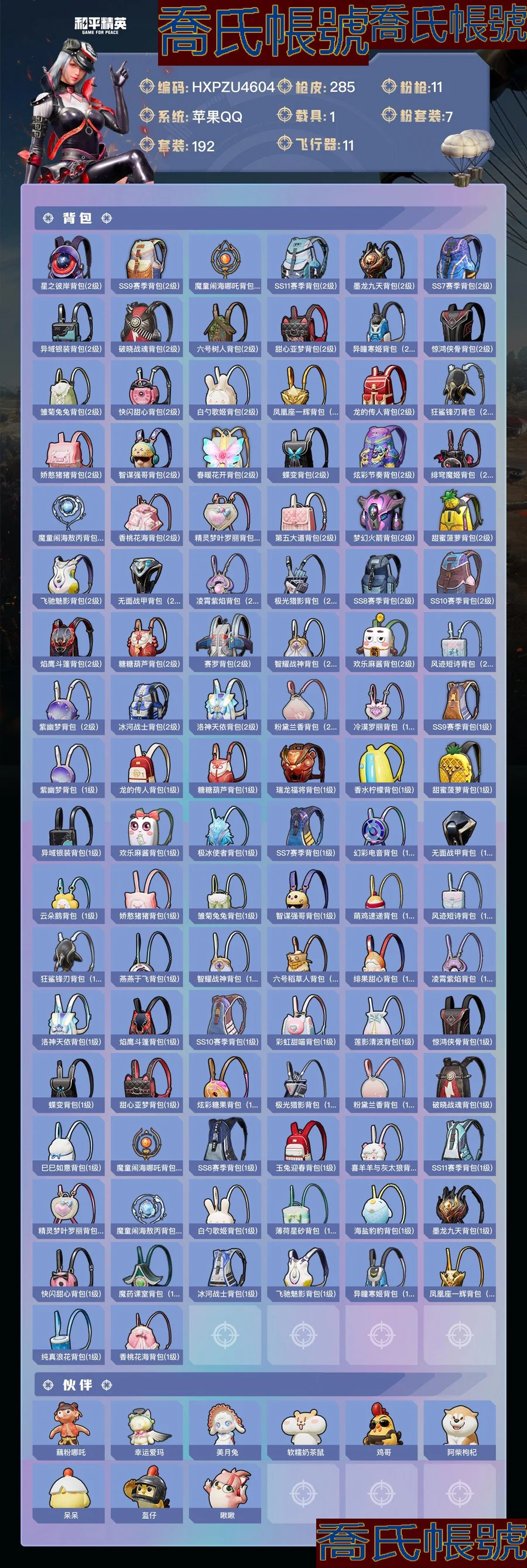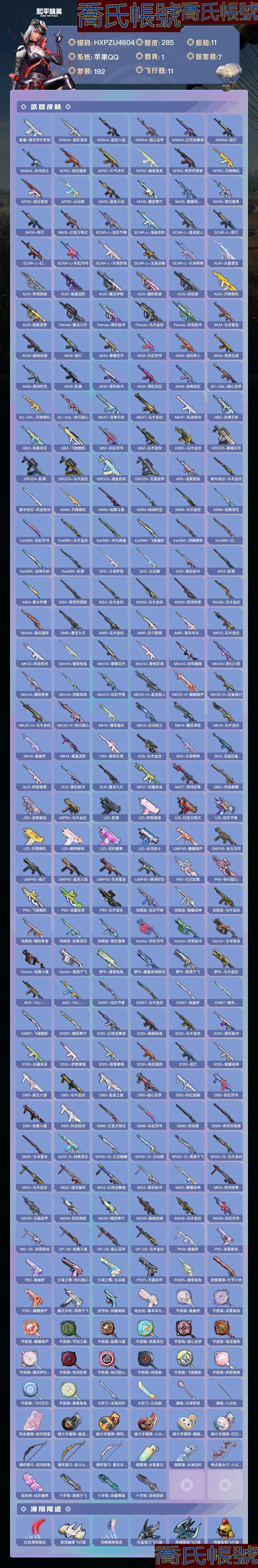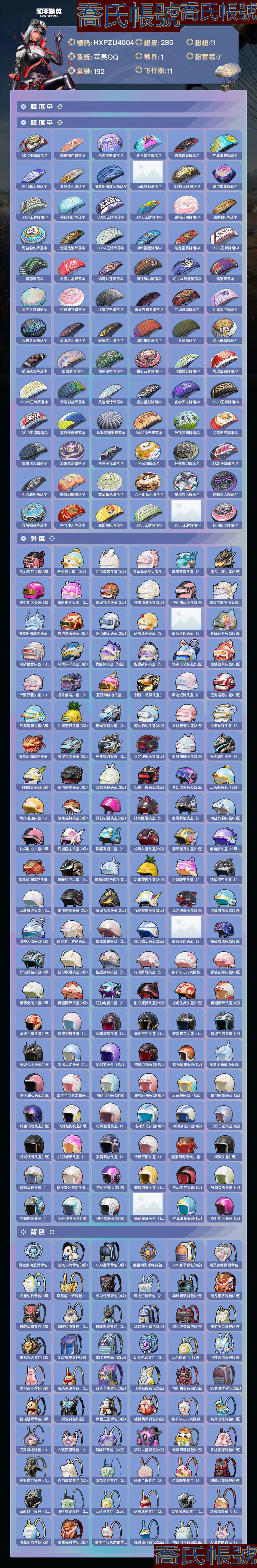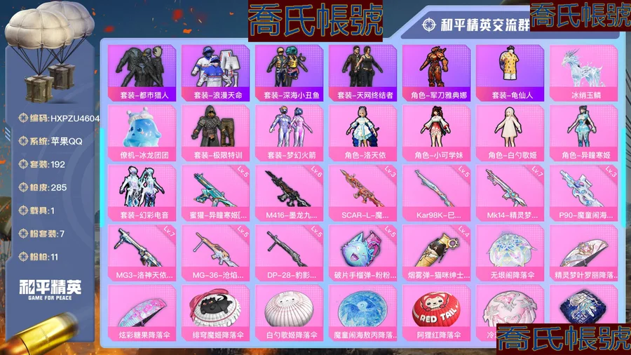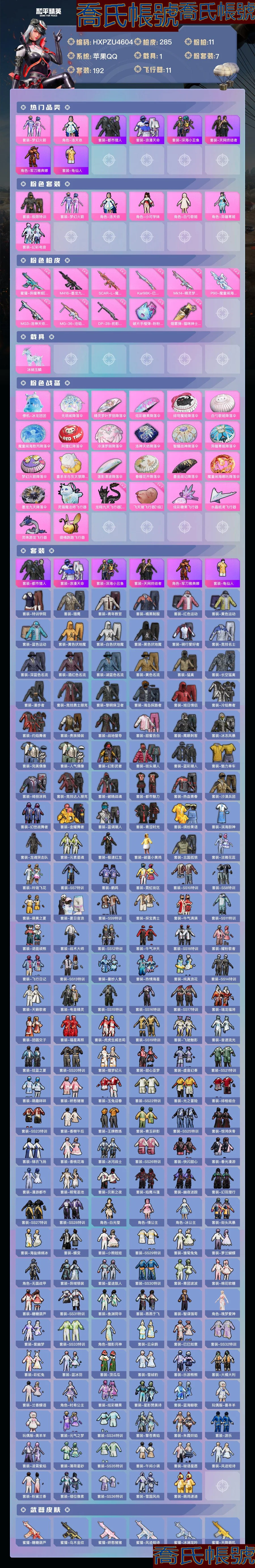 【OBHXPZU460442】熱力值:95058,7粉裝,11粉槍,1載具,26粉色戰備,192套裝,285槍械,341裝備,13滑翔尾翼,96降落傘;等級:Lv.71 歷史最高段位:卓越王牌22星 當前段位:超級.王牌;王牌印記16次 卓越印記2次;地鐵滿天賦; 【熱門品類】:套裝-都市獵人,套裝-浪漫天命,套裝-深海小丑魚,套裝-天網終結者,角色-軍刀雅典娜,套裝-龜仙人;【粉色套裝】:粉裝-極限特訓,粉裝-夢幻火箭,角色-洛天依,角色-小可學妹,角色-白勺歌姬,角色-異瞳寒姬,粉裝-幻彩電音;【粉色槍械】:蜜獾-異瞳寒姬[5級],M416-墨龍九天[6級],SCAR-L-魔童鬧海哪吒[3級],Kar98K-巳巳如意[5級],Mk14-精靈夢葉羅麗[7級],P90-魔童鬧海敖丙[3級],MG3-洛神天依[7級],MG-36-滄焰雙生[5級],DP-28-豹影疾電[5級],破片手榴彈-粉粉貓爪[5級],煙霧彈-貓咪紳士[4級];【粉色載具】:冰綃玉鱗;【粉色滑翔尾翼】:靈貓魔法師飛行器,龍翔九天飛行器[2級],飛天豬飛行器[1級],炫彩糖果飛行器,水晶紙鳶飛行器,靈珠游龍飛行器,提桶跑路飛行器;【粉色降落傘】:無垠閣降落傘,精靈夢葉羅麗降落傘,炫彩糖果降落傘,緋穹魔姬降落傘,白勺歌姬降落傘,魔童鬧海敖丙降落傘,阿狸紅降落傘,冷漠羅麗降落傘,洛神天依降落傘,智耀戰神降落傘,異瞳寒姬降落傘,夢幻火箭降落傘,喜羊羊與灰太狼降落傘,蓮影清波降落傘,春暖花開降落傘,墨金戰記降落傘,魔童鬧海哪吒降落傘,墨龍九天降落傘;【僚機】:僚機-冰龍團團;【其他套裝】:套裝-特訓學院,套裝-獵鷹,套裝-青年教官,套裝-橘黑制服,套裝-紅色運動,套裝-黃色運動,套裝-藍色運動,套裝-黃色伏地魔,套裝-白色伏地魔,套裝-黑色伏地魔,套裝-騎行愛好者,套裝-競技名士,套裝-深藍色名流,套裝-酒紅色名流,套裝-湖藍色名流,套裝-黃色名流,套裝-猛禽,套裝-長空猛禽,套裝-漫步者,套裝-競技勇士朋克,套裝-黎明保衛者,套裝-海島探路者,套裝-旭日情侶,套裝-冷焰舞者,套裝-灼焰舞者,套裝-貴族騎裝,套裝-戰地督導,套裝-甜蜜告白,套裝-鷹眼刺客,套裝-冰凍風暴,套裝-完美偶像,套裝-人氣偶像,套裝-幻影武者,套裝-街頭潮人,套裝-藍彩潮人,套裝-魅力單車,套裝-綺麗塗鴉,套裝-競技達人朋克,套裝-破曉戰魂,套裝-都市魅力,套裝-熱血青春,套裝-沙漠兵團,套裝-幻世戰舞者,套裝-金耀舞者,套裝-藍調潮人,套裝-青澀時光,套裝-繽紛果語,套裝-濱海廚神,套裝-龍魂突擊隊,套裝-元素星魂,套裝-極速紅龍,套裝-破蛋小黃雞,套裝-北國孤狼,套裝-淡雅花蕊,套裝-玲瓏飛花,套裝-SS7特訓,套裝-鶴鳴,套裝-霓虹街區,套裝-SS10特訓,套裝-SS8特訓,套裝-萌黃之夏,套裝-夏日音浪,套裝-SS9特訓,套裝-探寶勇士,套裝-牛氣滿滿,套裝-SS11特訓,套裝-詭面頑熊,套裝-戰術大師,套裝-SS12特訓,套裝-牛氣沖天,套裝-SS18特訓,套裝-耀粉歌者,套裝-飛行日記,套裝-SS13特訓,套裝-曼妙人魚,套裝-熱情海星,套裝-純真浪花,套裝-SS14特訓,套裝-天籟歌者,套裝-電音精靈,套裝-SS15特訓,套裝-SS16特訓,套裝-SS17特訓,套裝-瑞龍福將,套裝-團圓交子,套裝-福星高照,套裝-虎虎生威吉莉,套裝-SS19特訓,套裝-飛馳魅影,套裝-音速流光,套裝-炫藍之夏,套裝-SS20特訓,套裝-獵夢紀元,套裝-甜心亞夢,套裝-虛音幻奏,套裝-SS21特訓,套裝-萌趣咩咩,套裝-嬌憨豬豬,套裝-玉兔迎春,套裝-SS22特訓,套裝-光之冒險,套裝-緋格組合,套裝-SS23特訓,套裝-香榭午後,套裝-王牌教練,套裝-青玉碎影,套裝-SS25特訓,套裝-驚鴻俠骨,套裝-錦衣飛揚,套裝-香桃花海,套裝-冰河戰士,套裝-SS26特訓,套裝-快閃甜心,套裝-春光漫遊,套裝-漫遊都市,套裝-明鴛聖池,套裝-貝斯之夜,套裝-焰鷹斗篷,套裝-幽夜迷蹤,套裝-幻羽潛行,套裝-SS27特訓,套裝-SS28特訓,角色-白光瑩,角色-情公主,角色-冰公主,套裝-街頭風暴,套裝-海鹽綿綿冰,套裝-蝶變,套裝-小熊娃娃,套裝-SS29特訓,套裝-雛菊兔兔,套裝-蘿蘭蝴蝶,角色-無面戰甲,套裝-異域銀裝,套裝-星途旅人,套裝-SS30特訓,套裝-青團波波,套裝-棉花軟糖,套裝-糖糖葫蘆,套裝-SS31特訓,套裝-魚淵荷華,套裝-燕燕於飛,套裝-智謀強哥,角色-瑰夢愛神,套裝-紫幽夢,套裝-SS33特訓,角色-獵影月神,套裝-雲朵鵝,套裝-巳巳如意,套裝-SS32特訓,套裝-彩虹兔,套裝-藍冰羽,套裝-頂瓜瓜,套裝-雪絨豹,套裝-樂遊熊熊,套裝-大橘大利,套裝-蘭香蝶語,角色-時希公主,套裝-炫彩糖果,套裝-星影讚美詩,套裝-藍海鯨歌,玩偶服-喜羊羊,玩偶服-美羊羊,套裝-元氣之夢,套裝-SS34特訓,套裝-擎蒼青焰,套裝-朱霞熾焰,套裝-遊樂,套裝-凌霄紫焰,套裝-薄荷星砂,套裝-SS35特訓,套裝-午間小調,套裝-秘語星願,套裝-風跡短詩,套裝-粉黛蘭香,套裝-錯位畫素,套裝-SS36特訓,套裝-雪國風尚,套裝-萌雞速遞;其他槍械:蜜獾-糖糖葫蘆,蜜獾-烏木金紋,蜜獾-嬌憨豬豬,蜜獾-風跡短詩,蜜獾-冰瀾龍吟,蜜獾-天降萌嘰,蜜獾-精靈夢葉羅麗,M16A4-蓮影清波,M16A4-藍色火焰,M16A4-甜心亞夢,M16A4-幻世戰舞者,M16A4-夜燈,M16A4-冰河戰士,M762-瑞龍福將,M762-牛氣沖天,M762-雛菊兔兔,M762-奇異狩獵者,M762-天降萌嘰,M762-緋紅前夜,M762-雲朵鵝,M416-藍色火焰,M416-糯團青竹,M416-魔童鬧海敖閏,M416-錯位畫素,M416-夜燈,M416-紅色方程式,SCAR-L-炫彩節奏,SCAR-L-海鹽豹豹,SCAR-L-星途旅人,SCAR-L-夜燈,SCAR-L-紅色方程式,SCAR-L-彩虹符號,SCAR-L-冷漠羅麗,SCAR-L-玉兔迎春,SCAR-L-樂遊熊熊,AUG-冰晶雪寶,AUG-異域銀裝,AUG-紫晶流影,AUG-魔法學院,AUG-耀粉歌者,AUG-終結者,AUG-天降萌嘰,AUG-甜蜜菠蘿,Famas-墨龍九天,Famas-霓彩脈衝,Famas-烏木金紋,Famas-