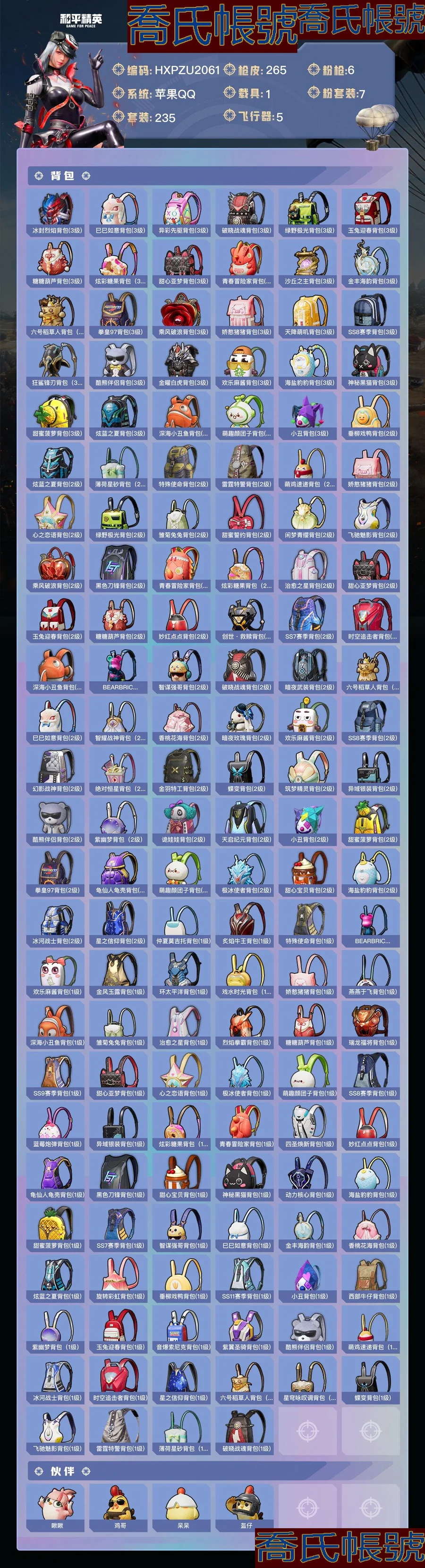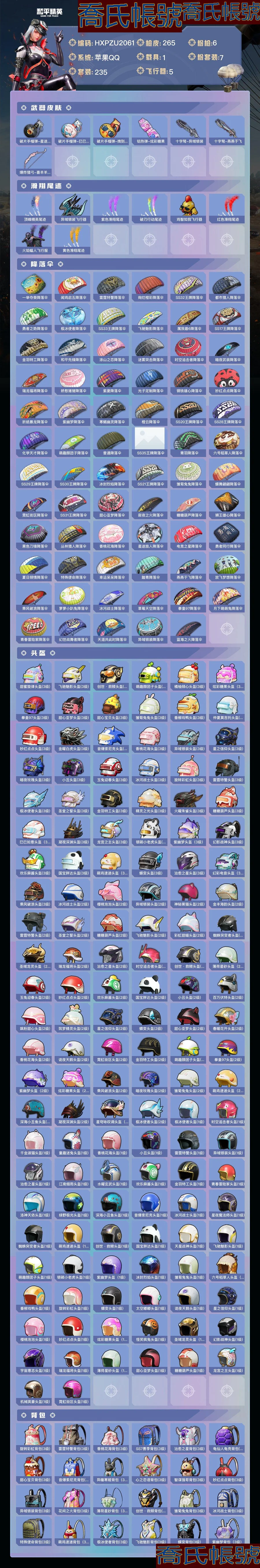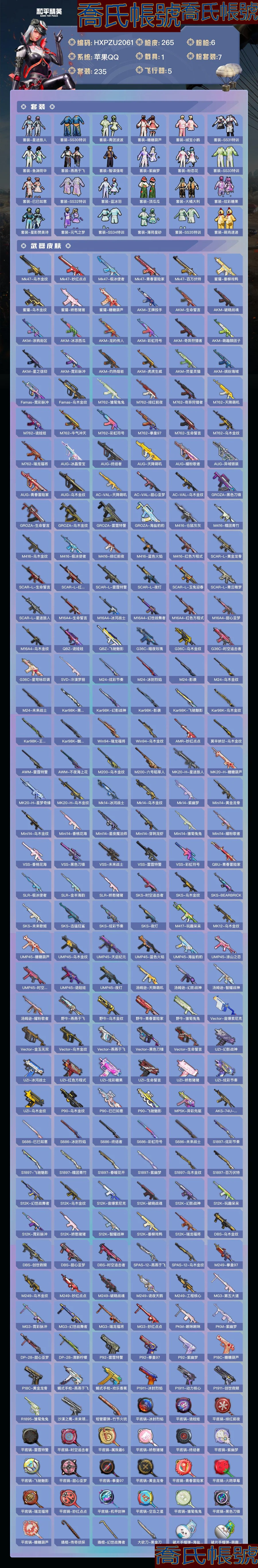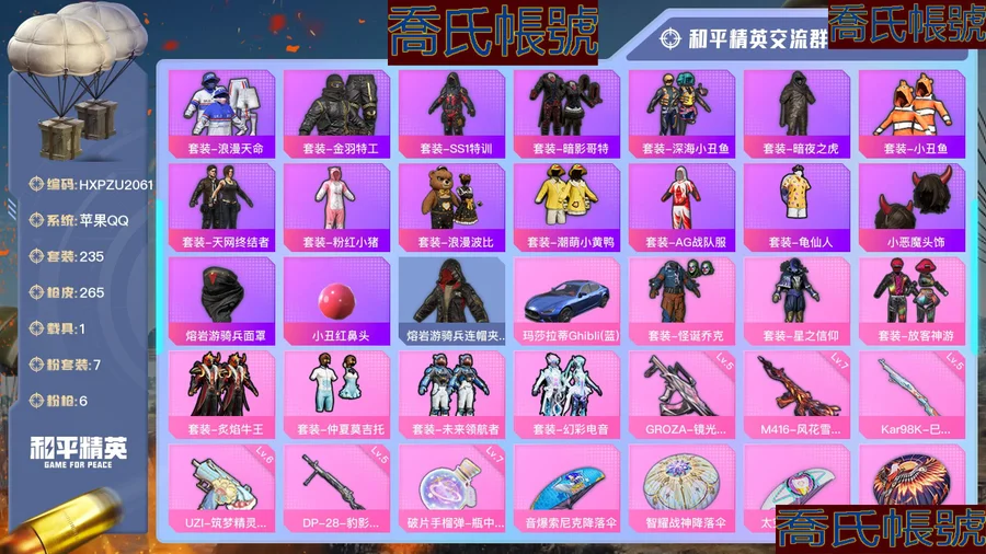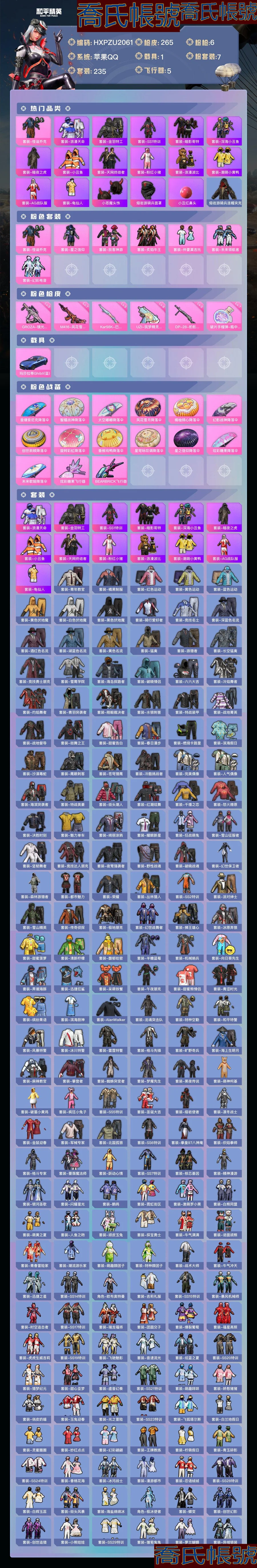 【OBHXPZU206142】熱力值:85987,7粉裝,6粉槍,1載具,15粉色戰備,235套裝,265槍械,361裝備,10滑翔尾翼,84降落傘;等級:Lv.69 歷史最高段位:絕世王牌17星 當前段位:榮耀.皇冠Ⅴ;王牌印記11次 卓越印記4次 傳奇印記1次 絕世印記1次;地鐵滿天賦; 【熱門品類】:套裝-浪漫天命,套裝-金羽特工,套裝-SS1特訓,套裝-暗影哥特,套裝-深海小丑魚,套裝-暗夜之虎,套裝-小丑魚,套裝-天網終結者,套裝-粉紅小豬,套裝-浪漫波比,套裝-潮萌小黃鴨,套裝-AG戰隊服,套裝-龜仙人,小惡魔頭飾,熔岩遊騎兵面罩,小丑紅鼻頭,熔岩遊騎兵連帽夾克;【粉色套裝】:粉裝-怪誕喬克,粉裝-星之信仰,粉裝-放客神遊,粉裝-炙焰牛王,粉裝-仲夏莫吉托,粉裝-未來領航者,粉裝-幻彩電音;【粉色槍械】:GROZA-鏡光銀凌[5級],M416-風花雪月[7級],Kar98K-巳巳如意[5級],UZI-築夢精靈[6級],DP-28-豹影疾電[5級],破片手榴彈-瓶中星球[7級];【粉色載具】:瑪莎拉蒂Ghibli(藍);【粉色滑翔尾翼】:炫彩糖果飛行器,BEARBRICK飛行器;【粉色降落傘】:音爆索尼克降落傘,智耀戰神降落傘,太空嘟嘟降落傘,風花雪月降落傘,橘柚傾心降落傘,幻影戰神降落傘,創世救贖降落傘,旋轉彩虹降落傘,垂柳戲鴨降落傘,星穹詠嘆調降落傘,星之信仰降落傘,炫彩糖果降落傘,未來歌姬降落傘;【其他套裝】:套裝-青年教官,套裝-橘黑制服,套裝-紅色運動,套裝-黃色運動,套裝-藍色運動,套裝-黃色伏地魔,套裝-白色伏地魔,套裝-黑色伏地魔,套裝-騎行愛好者,套裝-競技名士,套裝-深藍色名流,套裝-酒紅色名流,套裝-湖藍色名流,套裝-黃色名流,套裝-猛禽,套裝-遊獵者,套裝-長空猛禽,套裝-競技勇士朋克,套裝-雪鷹學院,套裝-海島探路者,套裝-破曉情侶,套裝-六六大吉,套裝-冷焰舞者,套裝-灼焰舞者,套裝-青羽突襲者,套裝-剛毅裁決者,套裝-水銀刺客,套裝-特戰裝甲,套裝-戰地菁英,套裝-戰地督導,套裝-街舞之王,套裝-甜蜜告白,套裝-春日漫步,套裝-燃燒卡路里,套裝-濱海假日,套裝-沙漠毒蛇,套裝-鷹眼刺客,套裝-蒼穹獵鷹,套裝-冷酷挑戰者,套裝-完美偶像,套裝-人氣偶像,套裝-海濱突襲者,套裝-特戰英豪,套裝-街頭潮人,套裝-紅潮炫舞,套裝-千禧之戀,套裝-怒火燎原,套裝-決勝時刻,套裝-魅力單車,套裝-綺麗塗鴉,套裝-耀眼新星,套裝-狂戰萌兔,套裝-雪山征服者,套裝-堅韌舞者,套裝-競技達人朋克,套裝-夜鶯強襲者,套裝-野性戰魂,套裝-破曉戰魂,套裝-幻世保衛者,套裝-森林遊獵者,套裝-都市魅力,套裝-榮耀,套裝-叢林獵人,套裝-SS2特訓,套裝-派對紳士,套裝-雪山精英,套裝-傳奇偵探,套裝-極地朋克,套裝-幻世戰舞者,套裝-獅王雄心,套裝-冰原奔狼,套裝-甜蜜菠蘿,套裝-清新檸檬,套裝-馥郁哈密,套裝-半糖藍莓,套裝-機械哨兵,套裝-向日葵先生,套裝-弄潮海豚,套裝-迅捷狂鯊,套裝-呆萌鐵蟹,套裝-午夜朋克,套裝-甜蜜熊情侶,套裝-青澀時光,套裝-繽紛果語,套裝-濱海廚神,套裝-AlanWalker,套裝-龍魂突擊隊,套裝-特種空勤,套裝-和平特警,套裝-風暴特警,套裝-冰川特警,套裝-雷霆特警,套裝-格鬥先鋒,套裝-曠野奇兵,套裝-海上生明月,套裝-麻辣教官,套裝-攀登者,套裝-蜘蛛突變者,套裝-夢魘先生,套裝-黑夜傳說,套裝-萌神柯基,套裝-破蛋小黃雞,套裝-瘋狂小兔子,套裝-SS5特訓,套裝-聖誕大吉,套裝-熔岩使者,套裝-凜冬戰士,套裝-金鼠迎春,套裝-軍械專家,套裝-北國孤狼,套裝-SS6特訓,套裝-拳皇97八神庵,套裝-熾焰拳師,套裝-格鬥專家,套裝-薔薇魔法師,套裝-躍動心情,套裝-SS7特訓,套裝-核芯基因,套裝-精神漫遊,套裝-銀河聖歌,套裝-閃耀星光,套裝-鶴鳴,套裝-霓虹街區,套裝-激萌羅小黑,套裝-白熊同盟,套裝-萌黃之夏,套裝-人魚之吻,套裝-頑皮玉兔,套裝-探寶勇士,套裝-牛氣滿滿,套裝-詭面頑熊,套裝-青春冒險家,套裝-潮流遊樂家,套裝-萌趣顏糰子,套裝-特種顏糰子,套裝-戰術大師,套裝-牛氣沖天,套裝-迅捷之星,套裝-SS14特訓,角色-歐布奧特曼,套裝-吉莉禮服,套裝-SS15特訓,套裝-暴風機械師,套裝-時空追擊者,套裝-SS17特訓,套裝-瑞龍福將,套裝-團圓交子,套裝-爆裂葡萄,套裝-福星高照,套裝-虎虎生威吉莉,套裝-SS19特訓,套裝-飛馳魅影,套裝-音速流光,套裝-炫藍之夏,套裝-SS20特訓,套裝-獵夢紀元,套裝-甜心亞夢,套裝-虛音幻奏,套裝-SS21特訓,套裝-萌趣咩咩,套裝-嬌憨豬豬,套裝-俏皮奶喵,套裝-玉兔迎春,套裝-光之冒險,套裝-SS23特訓,套裝-飛狐塔爾斯,套裝-白蘭地假日,套裝-靈蜜圈圈,套裝-妙紅點點,套裝-幻彩翩翩,套裝-王牌教練,套裝-檸萌假日,套裝-青玉碎影,套裝-SS24特訓,套裝-香桃花海,套裝-冰河戰士,套裝-漫遊都市,套裝-戀語絨絨,套裝-SS28特訓,套裝-白輝玉蕊,套裝-街頭風暴,套裝-海鹽綿綿冰,角色-極冰使者,套裝-蝶變,套裝-創世幻影,套裝-創世追獵,套裝-小熊娃娃,套裝-SS29特訓,套裝-雛菊兔兔,套裝-蘿蘭蝴蝶,套裝-異域銀裝,套裝-星途旅人,套裝-SS30特訓,套裝-青團波波,套裝-糖糖葫蘆,套裝-絨寶小鵝,套裝-SS31特訓,套裝-魚淵荷華,套裝-燕燕於飛,套裝-智謀強哥,套裝-紫幽夢,套裝-粉戀花,套裝-SS33特訓,套裝-巳巳如意,套裝-SS32特訓,套裝-藍冰羽,套裝-頂瓜瓜,套裝-大橘大利,套裝-炫彩糖果,套裝-星影讚美詩,套裝-元氣之夢,套裝-SS34特訓,套裝-薄荷星砂,套裝-SS35特訓,套裝-萌雞速遞;其他槍械:Mk47-烏木金紋,Mk47-妙紅點點,Mk47-極冰使者,Mk47-青春冒險家,Mk47-百萬伏特,蜜獾-垂柳戲鴨,蜜獾-烏木金紋,蜜獾-嬌憨豬豬,蜜獾-糖糖葫蘆,AKM-王牌投手,AKM-生