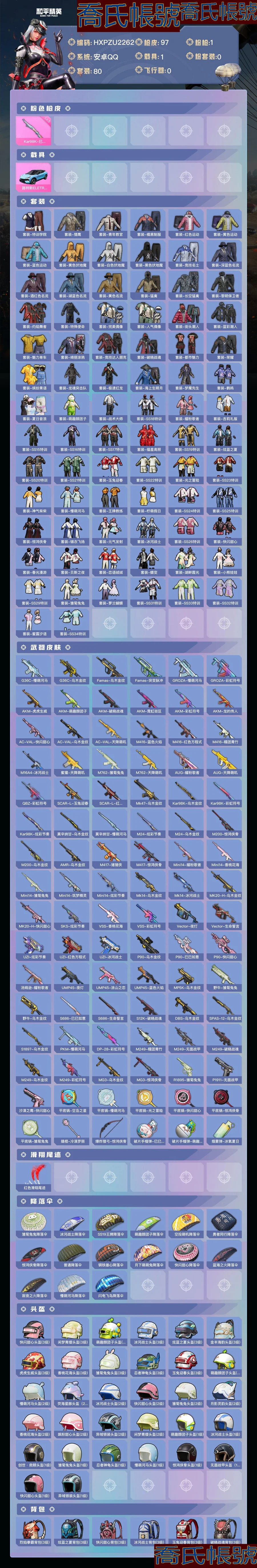 【OBHXPZU226242】熱力值:28861,1粉槍,1載具,80套裝,97槍械,88裝備,1滑翔尾翼,15降落傘;等級:Lv.57 歷史最高段位:超級王牌3星 當前段位:英勇.黃金Ⅱ;王牌印記3次; 【粉色槍械】:Kar98K-巳巳如意[5級];【粉色載具】:路特斯ELETRE(冰川藍);【其他套裝】:套裝-特訓學院,套裝-獵鷹,套裝-青年教官,套裝-橘黑制服,套裝-紅色運動,套裝-黃色運動,套裝-藍色運動,套裝-黃色伏地魔,套裝-白色伏地魔,套裝-黑色伏地魔,套裝-競技名士,套裝-深藍色名流,套裝-酒紅色名流,套裝-湖藍色名流,套裝-黃色名流,套裝-猛禽,套裝-長空猛禽,套裝-黎明保衛者,套裝-灼焰舞者,套裝-特殊使命,套裝-完美偶像,套裝-人氣偶像,套裝-街頭潮人,套裝-藍彩潮人,套裝-魅力單車,套裝-綺麗塗鴉,套裝-競技達人朋克,套裝-破曉戰魂,套裝-都市魅力,套裝-榮耀,套裝-繽紛果語,套裝-龍魂突擊隊,套裝-極速紅龍,套裝-海上生明月,套裝-夢魘先生,套裝-鶴鳴,套裝-夏日音浪,套裝-萌趣顏糰子,套裝-戰術大師,套裝-SS18特訓,套裝-耀粉歌者,套裝-吉莉禮服,套裝-SS15特訓,套裝-SS16特訓,套裝-SS17特訓,套裝-福星高照,套裝-SS19特訓,套裝-炫藍之夏,套裝-SS20特訓,套裝-SS21特訓,套裝-玉兔迎春,套裝-SS22特訓,套裝-光之冒險,套裝-SS23特訓,套裝-神氣柴柴,套裝-懵萌河馬,套裝-王牌教練,套裝-檸萌假日,套裝-SS24特訓,套裝-SS25特訓,套裝-驚鴻俠骨,套裝-錦衣飛揚,套裝-元氣發射,套裝-冰河戰士,套裝-SS26特訓,套裝-快閃甜心,套裝-春光漫遊,套裝-貝斯之夜,套裝-戀語絨絨,套裝-蝶變,套裝-湖畔霞光,套裝-小熊娃娃,套裝-SS29特訓,套裝-雛菊兔兔,套裝-蘿蘭蝴蝶,套裝-SS31特訓,套裝-SS33特訓,套裝-SS32特訓,套裝-蜜露汐語,套裝-SS34特訓;其他槍械:G36C-懵萌河馬,G36C-烏木金紋,Famas-烏木金紋,Famas-突變脈衝,GROZA-懵萌河馬,GROZA-彩虹符號,AKM-虎虎生威,AKM-萌趣顏糰子,AKM-破曉戰魂,AKM-霓虹街區,AKM-彩虹符號,AKM-龍的傳人,AC-VAL-快閃甜心,AC-VAL-烏木金紋,AC-VAL-天降萌嘰,M416-藍色火焰,M416-紅色方程式,M416-糯團青竹,M16A4-冰河戰士,蜜獾-天降萌嘰,M762-雛菊兔兔,M762-天降萌嘰,AUG-耀粉歌者,AUG-天降萌嘰,QBZ-彩虹符號,SCAR-L-玉兔迎春,SCAR-L-紅色方程式,Mk47-烏木金紋,Kar98K-烏木金紋,Kar98K-彩虹符號,Kar98K-炫彩節奏,莫辛納甘-烏木金紋,莫辛納甘-懵萌河馬,M24-炫彩節奏,M24-烏木金紋,M200-驚鴻俠骨,M200-烏木金紋,AMR-烏木金紋,M417-豬豬俠,M417-驚鴻俠骨,Mini14-耀粉歌者,Mini14-香桃花海,Mini14-雛菊兔兔,Mini14-築夢精靈,Mini14-炫彩節奏,Mk14-烏木金紋,Mk14-冰河戰士,MK20-H-烏木金紋,MK20-H-快閃甜心,SKS-炫彩節奏,VSS-香桃花海,VSS-彩虹符號,Vector-夜燈,Vector-生命誓言,UZI-炫彩節奏,UZI-紅色方程式,UZI-冰河戰士,P90-烏木金紋,P90-巳巳如意,P90-快閃甜心,湯姆遜-耀粉歌者,UMP45-夜燈,UMP45-塗山之戀,UMP45-藍色火焰,MP5K-烏木金紋,野牛-雛菊兔兔,野牛-烏木金紋,S686-巳巳如意,S686-生命誓言,S12K-破曉戰魂,DBS-烏木金紋,SPAS-12-烏木金紋,S1897-烏木金紋,PKM-懵萌河馬,DP-28-彩虹符號,M249-糯團青竹,M249-無面戰甲,M249-破曉戰魂,M249-烏木金紋,M249-彩虹符號,MG3-烏木金紋,MG3-驚鴻俠骨,R1895-雛菊兔兔,P1911-無面戰甲,沙漠之鷹-快閃甜心,平底鍋-空島之星,平底鍋-懵萌河馬,平底鍋-光之冒險,平底鍋-快閃甜心,平底鍋-驚鴻俠骨,平底鍋-雛菊兔兔,撬棍-冷漠羅麗,爆炸獵弓-驚鴻俠骨,破片手榴彈-巳巳如意,破片手榴彈-萌趣顏糰子,煙霧彈-冰氧夏日;【其他滑翔尾翼】:紅色滑翔尾跡;【其他降落傘】:雛菊兔兔降落傘,冰河戰士降落傘,SS19王牌降落傘,萌趣顏糰子降落傘,空投萌嘰降落傘,勇者同行降落傘,驚鴻俠骨降落傘,普通降落傘,鋼鐵雄心降落傘,月下萌萌兔降落傘,快閃甜心降落傘,藍海之火降落傘,寂夜之火降落傘,懵萌河馬降落傘,閃電飛鳥降落傘;【夥伴】:夥伴-盔仔,夥伴-呆呆,【實際資訊請以最終驗號結果為準】