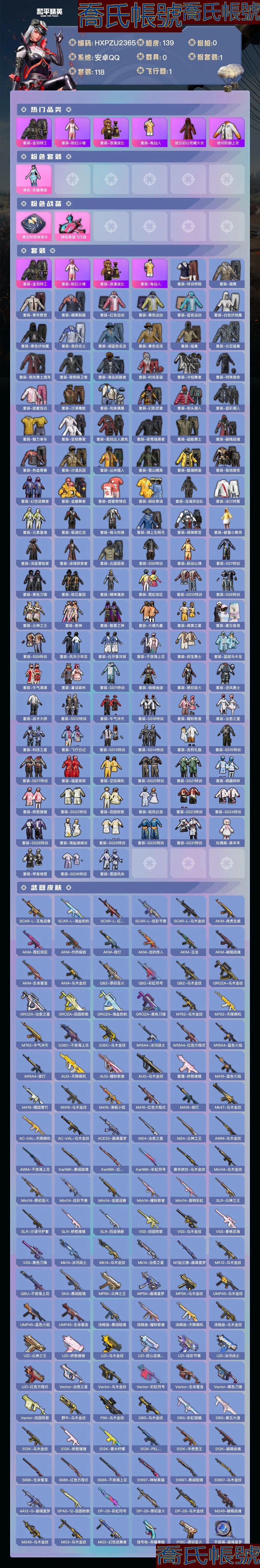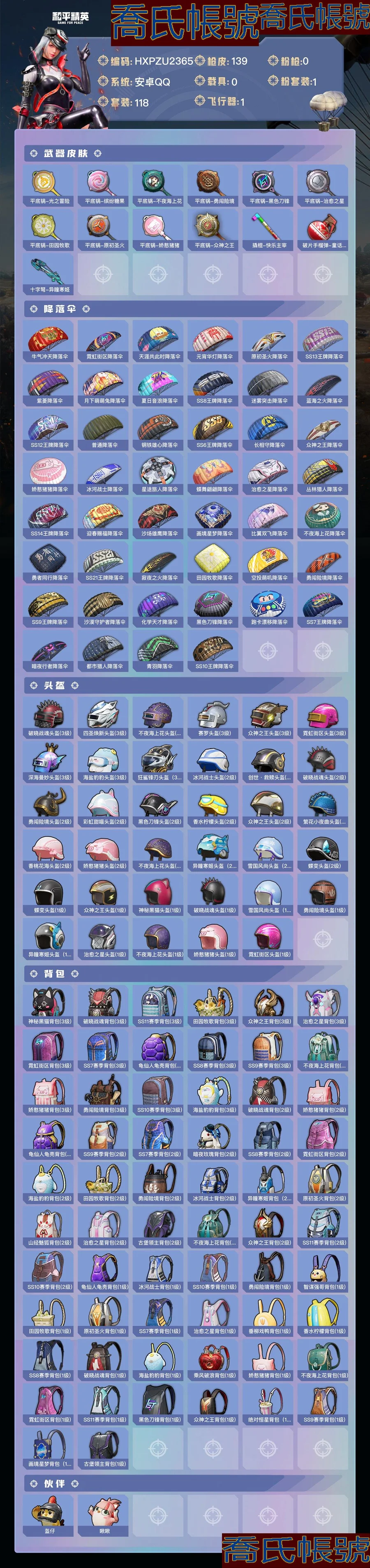 【OBHXPZU236542】熱力值:37890,1粉裝,2粉色戰備,118套裝,139槍械,115裝備,1滑翔尾翼,47降落傘;等級:Lv.63 歷史最高段位:超級王牌2星 當前段位:堅韌.鉑金Ⅴ;王牌印記10次; 【熱門品類】:套裝-金羽特工,套裝-粉紅小豬,套裝-浪漫波比,套裝-龜仙人,旭日初心兜帽大衣,絕對防禦上衣;【粉色套裝】:角色-異瞳寒姬;【粉色滑翔尾翼】:神秘黑貓飛行器;【粉色降落傘】:青空秋雨降落傘;【其他套裝】:套裝-特訓學院,套裝-獵鷹,套裝-青年教官,套裝-橘黑制服,套裝-紅色運動,套裝-黃色運動,套裝-藍色運動,套裝-白色伏地魔,套裝-黑色伏地魔,套裝-競技名士,套裝-湖藍色名流,套裝-黃色名流,套裝-猛禽,套裝-長空猛禽,套裝-競技勇士朋克,套裝-黎明保衛者,套裝-海島探路者,套裝-時尚聖誕,套裝-冷焰舞者,套裝-特殊使命,套裝-甜蜜告白,套裝-沙漠毒蛇,套裝-完美偶像,套裝-幻影武者,套裝-街頭潮人,套裝-藍彩潮人,套裝-魅力單車,套裝-堅韌舞者,套裝-競技達人朋克,套裝-夜鶯強襲者,套裝-超能勇士,套裝-破曉戰魂,套裝-熱血青春,套裝-沙漠兵團,套裝-叢林獵人,套裝-雪山精英,套裝-酷潮明星,套裝-極地朋克,套裝-幻世戰舞者,套裝-金耀舞者,套裝-甜蜜熊情侶,套裝-繽紛果語,套裝-龍魂突擊隊,套裝-冰川特警,套裝-元素星魂,套裝-極速紅龍,套裝-格鬥先鋒,套裝-海上生明月,套裝-麻辣教官,套裝-破蛋小黃雞,套裝-深藍冒險家,套裝-迷域探索者,套裝-北國孤狼,套裝-SS6特訓,套裝-躍動心情,套裝-SS7特訓,套裝-黑色刀鋒,套裝-核芯基因,套裝-精神漫遊,套裝-霓虹街區,套裝-SS10特訓,套裝-SS8特訓,套裝-眾神之王,套裝-愛神,套裝-智慧之神,套裝-大橘為重,套裝-萌黃之夏,套裝-夏日音浪,套裝-SS9特訓,套裝-風華少年志,套裝-白月香洋裝,套裝-不夜海上花,套裝-探寶勇士,套裝-藍甜馬卡龍,套裝-牛氣滿滿,套裝-童話森林,套裝-SS11特訓,套裝-驍騎迪迦,套裝-原初聖火,套裝-逆風勇士,套裝-戰術大師,套裝-SS12特訓,套裝-牛氣沖天,套裝-SS18特訓,套裝-耀粉歌者,套裝-治癒之星,套裝-科技之星,套裝-飛行日記,套裝-SS13特訓,套裝-SS14特訓,套裝-吉莉禮服,套裝-SS15特訓,套裝-SS17特訓,套裝-福星高照,套裝-空投萌嘰,套裝-SS20特訓,套裝-SS21特訓,套裝-萌趣咩咩,套裝-嬌憨豬豬,套裝-SS22特訓,套裝-田園牧歌,套裝-輕風白浪,套裝-SS23特訓,套裝-SS24特訓,套裝-SS28特訓,套裝-海鹽綿綿冰,套裝-SS29特訓,套裝-SS30特訓,套裝-SS31特訓,玩偶服-美羊羊,套裝-琴音綺想,套裝-SS36特訓,套裝-雪國風尚;其他槍械:SCAR-L-玉兔迎春,SCAR-L-海鹽豹豹,SCAR-L-紅色方程式,SCAR-L-炫彩節奏,SCAR-L-烏木金紋,AKM-虎虎生威,AKM-霓虹街區,AKM-灼熱熔岩,AKM-夜燈,AKM-龍的傳人,AKM-玉龍,AKM-破曉戰魂,AKM-生命誓言,AKM-烏木金紋,QBZ-原初聖火,QBZ-彩虹符號,QBZ-烏木金紋,GROZA-烏木金紋,GROZA-治癒之星,GROZA-田園牧歌,GROZA-海鹽豹豹,GROZA-黑色刀鋒,M762-烏木金紋,M762-天降萌嘰,M762-牛氣沖天,G36C-不夜海上花,G36C-烏木金紋,M16A4-冰河戰士,M16A4-紅色方程式,M16A4-藍色火焰,M16A4-夜燈,AUG-天降萌嘰,AUG-耀粉歌者,AUG-烏木金紋,蜜獾-嬌憨豬豬,M416-藍色火焰,M416-糯團青竹,M416-烏木金紋,M416-滑板小狐,M416-紅色方程式,M416-夜燈,Mk47-烏木金紋,AC-VAL-天降萌嘰,AC-VAL-烏木金紋,ACE32-畫境星夢,M24-治癒之星,M24-眾神之王,AWM-烏木金紋,AWM-不夜海上花,Kar98K-勇闖險境,Kar98K-紅色方程式,Kar98K-彩虹符號,莫辛納甘-烏木金紋,Mini14-烏木金紋,Mini14-原初聖火,Mini14-炫彩節奏,Mini14-金鼠迎春,Mini14-耀粉歌者,Mini14-旋轉彩虹,SLR-眾神之王,SLR-沙漠守護者,SLR-嬌憨豬豬,SLR-四聖煥新,VSS-田園牧歌,VSS-烏木金紋,VSS-香桃花海,VSS-黑色刀鋒,Mk14-冰河戰士,Mk14-烏木金紋,Mk14-治癒之星,M1加蘭德-畫境星夢,MK12-烏木金紋,QBU-不夜海上花,SKS-勇闖險境,MP5K-眾神之王,MP5K-畫境星夢,MP5K-烏木金紋,UMP45-烏木金紋,UMP45-藍色火焰,UMP45-生命誓言,湯姆遜-勇闖險境,湯姆遜-耀粉歌者,湯姆遜-天降萌嘰,湯姆遜-烏木金紋,UZI-眾神之王,UZI-嬌憨豬豬,UZI-烏木金紋,UZI-匠心至美(OPPO),UZI-炫彩節奏,UZI-冰河戰士,UZI-紅色方程式,Vector-治癒之星,Vector-烏木金紋,Vector-彩虹符號,Vector-生命誓言,Vector-黑色刀鋒,Vector-田園牧歌,野牛-烏木金紋,P90-烏木金紋,DBS-烏木金紋,DBS-彩虹甜喵,DBS-第五大道,S12K-烏木金紋,S12K-嬌憨豬豬,S12K-香水檸檬,S12K-PEL轟鳴競夢者,S12K-華貴君王,S12K-破曉戰魂,S686-生命誓言,S686-紅色方程式,S686-不夜海上花,S1897-神秘黑貓,S1897-勇闖險境,S1897-烏木金紋,AA12-G-畫境星夢,SPAS-12-田園牧歌,DP-28-彩虹符號,DP-28-原初聖火,DP-28-烏木金紋,M249-破曉戰魂,M249-烏木金紋,MG3-烏木金紋,MG3-幻世戰舞者,信號槍-異瞳寒姬,P18C-原初聖火,平底鍋-畫境星夢,平底鍋-光之冒險,平底鍋-繽紛糖果,平底鍋-不夜海上花,平底鍋-勇闖險境,平底鍋-黑色刀鋒,平底鍋-治癒之星,平底鍋-田園牧歌,平底鍋-原初聖火,平底鍋-嬌憨豬豬,平底鍋-眾神之王,撬棍-快樂主宰,破片手榴彈-童話森林,十字弩-異瞳寒姬;【其他降落傘】:牛氣沖天降落傘,霓虹街區降落傘,天涯共此時降落傘,元宵華燈降落傘,原初聖火降落傘,SS13王牌降落傘,紫菱降落傘,月下萌萌兔降落傘,夏日音浪降落傘,SS8王牌降落傘,迷霧突擊降落傘,藍海之火降落傘,SS12王牌降落傘,普通降落傘,鋼鐵雄心降落傘,SS6王牌降落傘,長相守降落傘,眾神之王降落傘,嬌憨豬豬降落傘,冰河戰士降落傘,星途旅人降落傘,蝶舞翩翩降落傘,治癒之星降落傘,叢林獵人降落傘,SS14王牌降落傘,迎