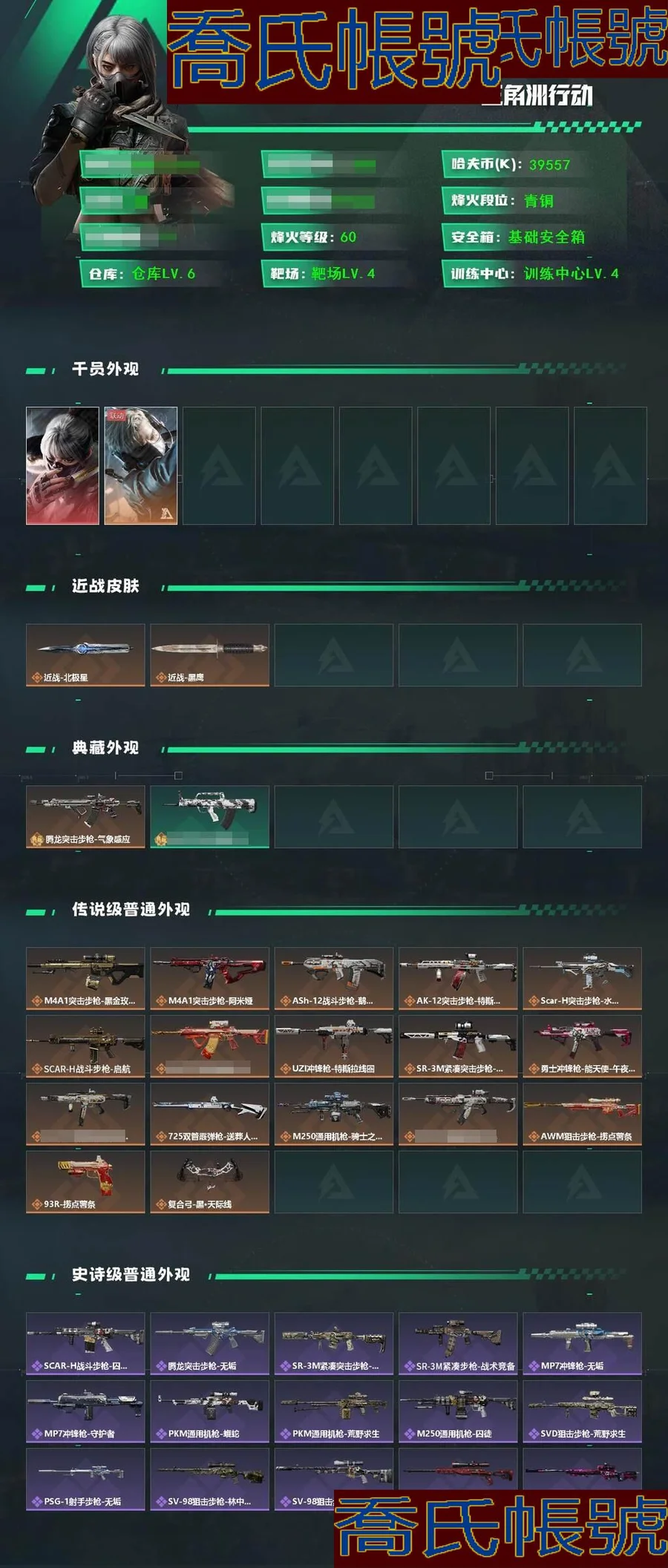 【OBSUUHK530742】總資產:202M,哈夫幣:3955W,武器皮膚:34,烽火60級:戰場11級:【安全箱】基礎安全箱;【特勤處等級】倉庫LV.6,靶場LV.4,訓練中心LV.4;【幹員皮膚】駭爪水墨雲圖,蜂醫送葬人無題密令;【近戰武器】近戰武器-北極星,近戰武器-黑鷹;【步槍皮膚】騰龍突擊步槍-氣象感應,M4A1突擊步槍-蝕金玫瑰,M4A1突擊步槍-阿米婭,ASh-12戰鬥步槍-鵝鴨殺,AK-12突擊步槍-特斯拉線圈,SCAR-H戰鬥步槍-水墨雲圖,SCAR-H戰鬥步槍-啟航,騰龍突擊步槍-撈點薯條,SCAR-H戰鬥步槍-囚徒,騰龍突擊步槍-無垢;【衝鋒槍皮膚】UZI衝鋒槍-特斯拉線圈,SR-3M緊湊突擊步槍-特斯拉線圈,勇士衝鋒槍-能天使-午夜郵差,QCQ171衝鋒槍-鵝鴨殺,SR-3M緊湊突擊步槍-荒野求生,SR-3M緊湊突擊步槍-戰術競備,MP7衝鋒槍-無垢,MP7衝鋒槍-守護者;【射手步槍皮膚】SVD狙擊步槍-荒野求生,PSG-1射手步槍-無垢;【狙擊步槍皮膚】AWM狙擊步槍-撈點薯條,SV-98狙擊步槍-林中獵手,SV-98狙擊步槍-囚徒,M700狙擊步槍-競技風,AWM狙擊步槍-無極限;【霰彈槍皮膚】725雙管霰彈槍-送葬人-無題密令;【輕機槍皮膚】M250通用機槍-騎士之心,QJB201輕機槍-鵝鴨殺,PKM通用機槍-蝮蛇,PKM通用機槍-荒野求生,M250通用機槍-囚徒;【手槍皮膚】93R-撈點薯條;(資訊源於賣家釋出,實際資訊以驗號為準)【QQ登入】【限時秒殺】39557k哈伏幣-193m流動資產-60烽火等級-青銅-11戰場等級-列兵 【幹員外觀】:駭爪-水墨雲圖,蜂醫-送葬人·無題密令 【近戰皮膚】:近戰-北極星,近戰-黑鷹 【典藏外觀】:騰龍突擊步槍-氣象感應,QBZ95-1突擊步槍-水墨迷彩 【傳說級普通外觀】:M4A1突擊步槍-蝕金玫瑰,M4A1突擊步槍-阿米婭,ASh-12戰鬥步槍-鵝鴨殺,AK-12突擊步槍-特斯拉線圈,SC