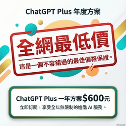 還在每個月被官方扣款 20 美金(約台幣 650 元)嗎?本賣場提供 「ChatGPT Plus 1年權益帳號」,一次付費,直接享有 365 天專業版功能!