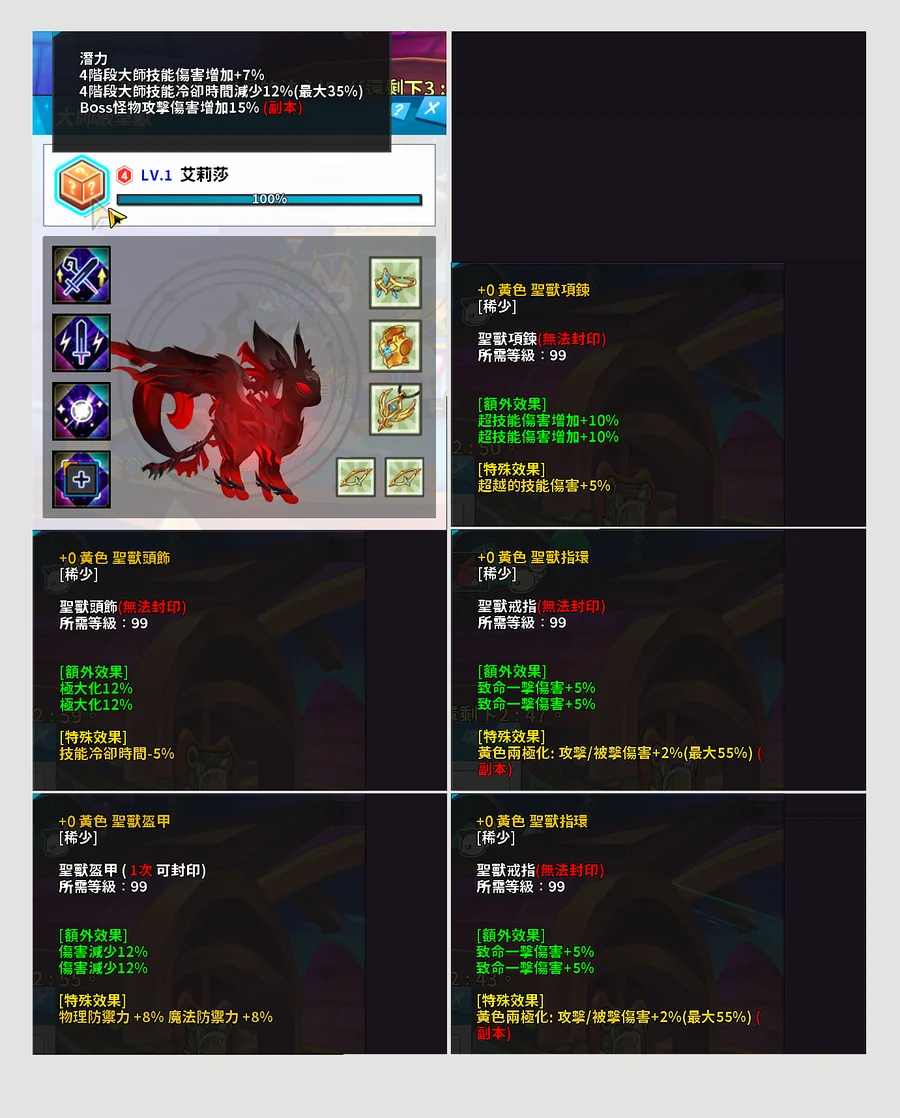 有聖獸黃+綠 各一套飾品保底進度:52%武器獎勵等級:11等