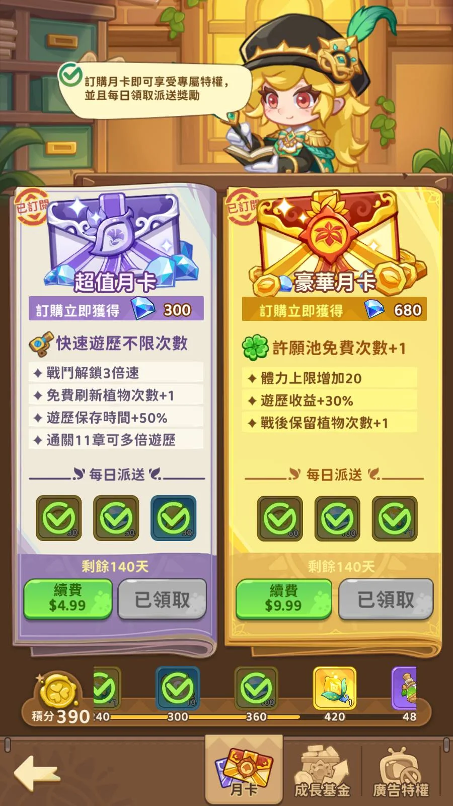 大小月卡還有140天(12月31日時記錄天數)