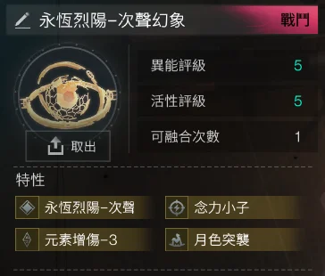 55永恆烈陽-逆軌星臨4金 (逆軌星臨+次聲幻象+月色突襲+元素增傷-3) = 1000t(該異常物無法融合)