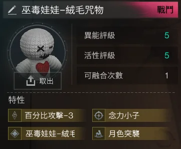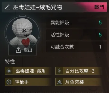 5-5巫毒娃娃-逆軌星臨4金(絨毛咒物+逆軌星臨+月色突襲+百分比攻擊-3) = 851t (該異常物無法融合)