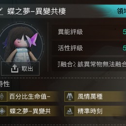 5-5 蝶之夢-異變共棲 4金 (異變共棲+風情萬種+霓虹閃爍+百分比生命值-3) = 744t (該異常物無法融合)