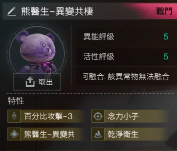 5-5 熊醫生-異變共棲 4金(異變共棲+念力小子+乾淨衛生+百分比攻擊-3) = 744t (該異常物無法融合)