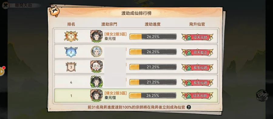 使用魔塊平台帳號登入囚龍功法/仙3五靈僧有月卡 該服第一名第二名浮動中 賣出前會持續遊玩伺服器:倩女2服3區飛升進度78% 目前飛升排第一位 圖片陸續更新新增神話弟子:鳳裡犧