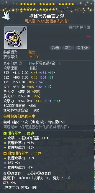 武器主職用潛:35%BOSS26%物攻(次頂職業主流主潛能 對等75%BOSS13%物攻 極限次頂)