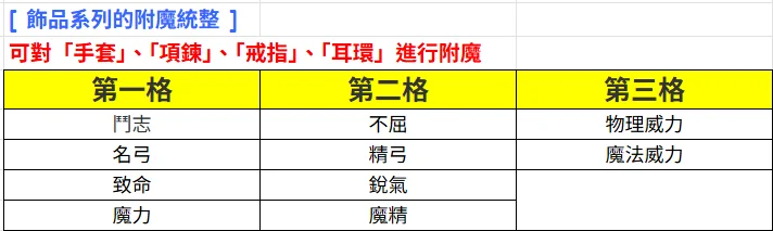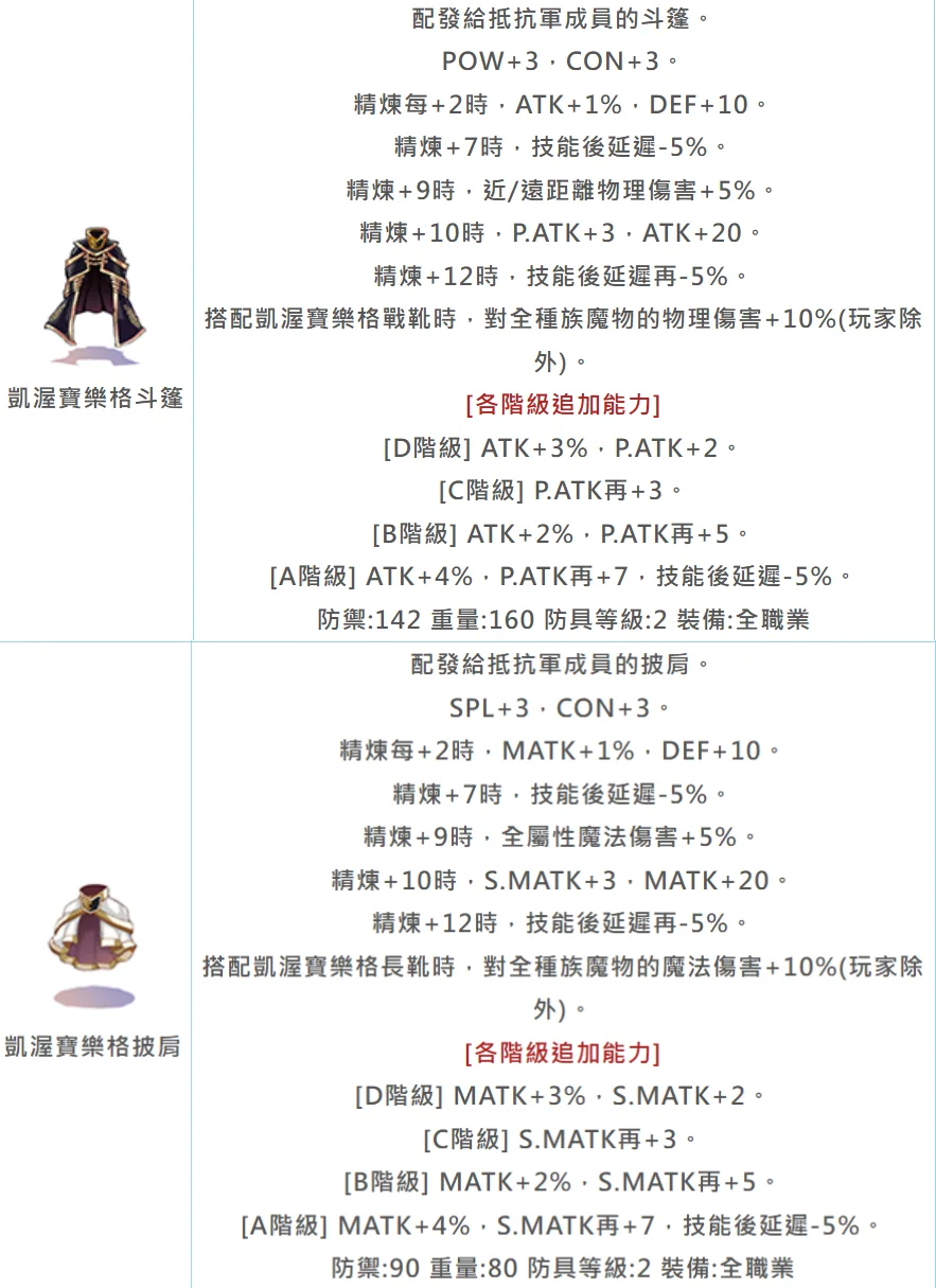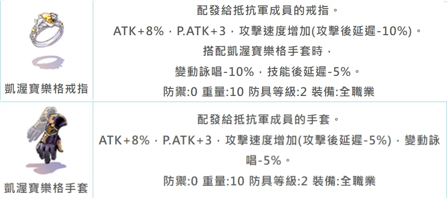 物理系 (戒指/手套) | ATK+16%, P.ATK+6 | 攻速延遲-15%、變詠-15%、技後延遲-5% |