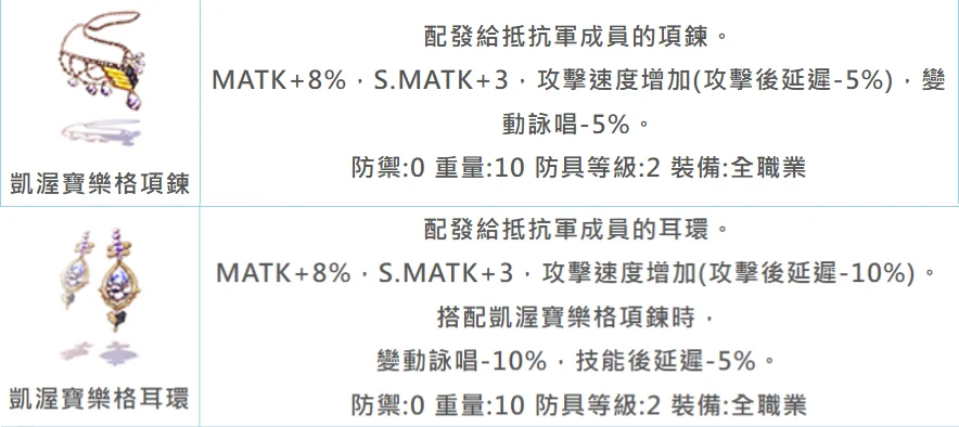 魔法系 (耳環/項鍊) | MATK+16%, S.MATK+6 | 攻速延遲-15%、變詠-15%、技後延遲-5% |