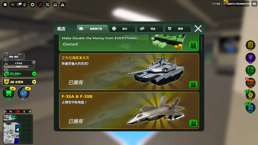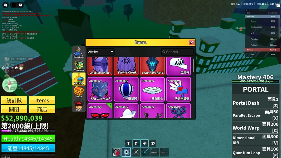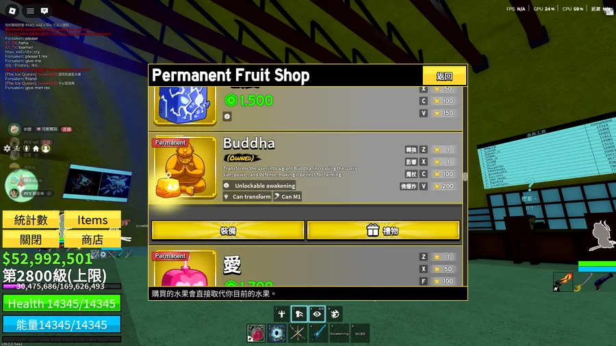 競爭者106等鉑金 戰爭大亨10重生 每日挑戰等級45 1.9B現金 BloxFruits 海盜820萬 永門、佛、九尾 神人拳 血拳 機器人 吸血鬼v4