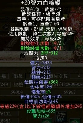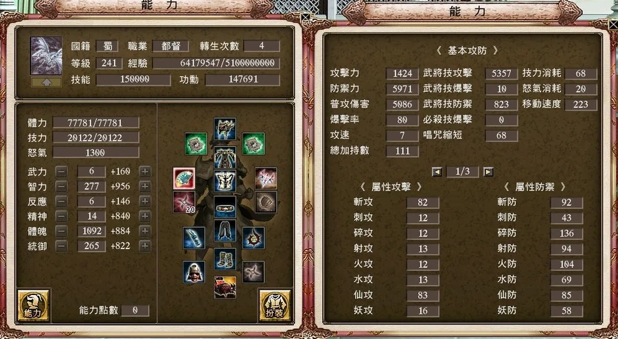 +20血啼櫻、+17強4申犬套、+15強4剛甲高階馬甲、+17三洞黑星金麟塔盾、+20強4七星腰帶、+17三洞秘製蒼天護腕、+17三洞血月、4軒轅槍、+6統兵遣將配飾、+5射裂配飾