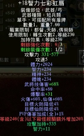 +18七彩虹扇、+17強4極.柳宿套、+15強3剛甲武雙內衣、+17強4黑星聚精盾衝剛護、+15三洞秘製蒼天護腕、+17三洞血月、+17木棉貓、4軒轅槍、+7統兵遣將配飾