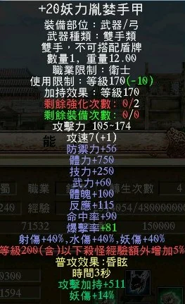 +15胤婪手甲、+17強4戌豚套、+17資訊貓、+15封射66%祕製護腕 、+6封斬46%奇聞護腕、+17三洞血月披風、雙聖龍護符、+17強4剛甲武雙內衣、+10天下布武配戒、+5真.射裂配飾