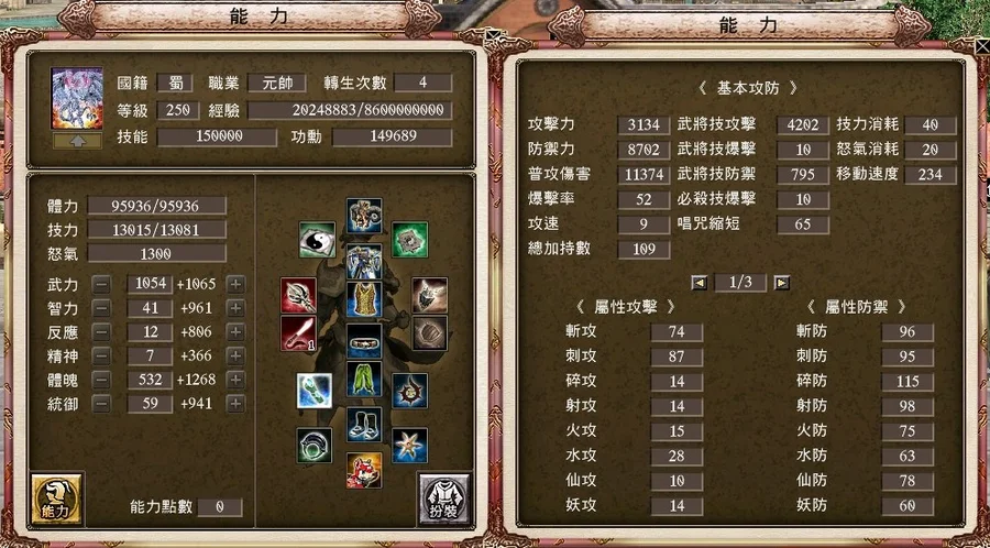 戰技:方天50等、八卦58等、大宛50等、丈八55等