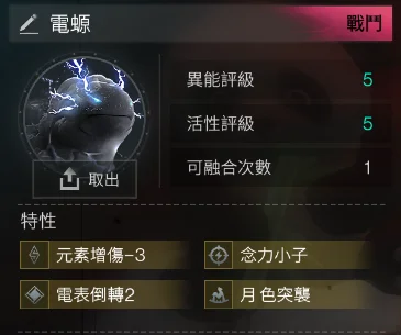 5-5 4金 電螈 (念力小子+電表倒轉2+月色突襲+元素增傷-3) = 425T (融合次數1)