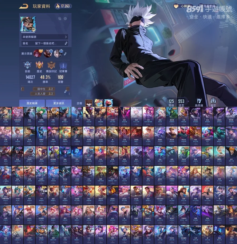 歷史璀璨傳說印記!!全英雄五百多造型!共125英雄553造型!共13次S戰場傳說印記!!常用奧義皆已升齊全!!