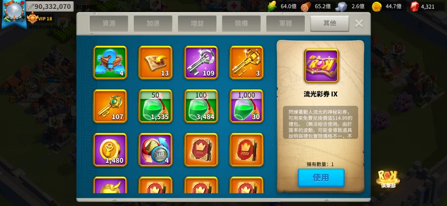 v18資源多,但都開了,機票聯盟幣夠換,但資源那麼多乾脆留著打完。金頭218,持續登錄中。月卡還20天皮膚兩個:kvk的步兵防禦10和六幣的弓兵防禦10帶一個25級,2000多萬的小號。綁定只有lls,可以整組給。誠可議價。