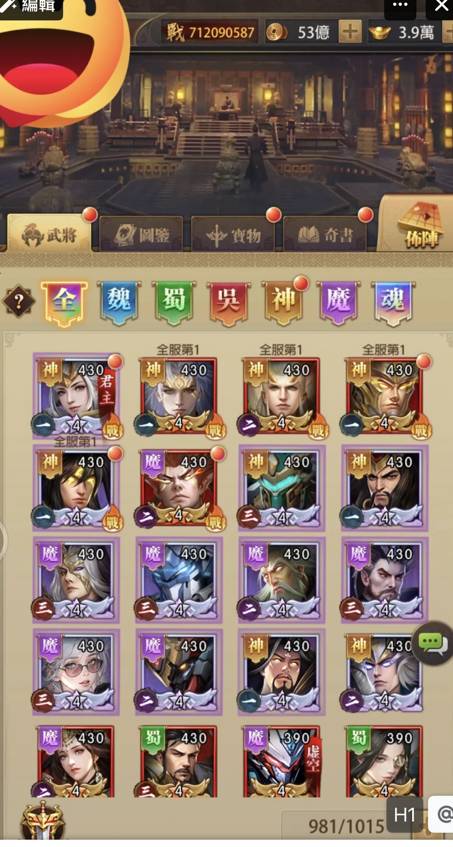 三隊總戰力17.5億 目前主戰力7.1億 快過年了買個強力帳號開心一下吧 意者私訊報價 鳥價不回