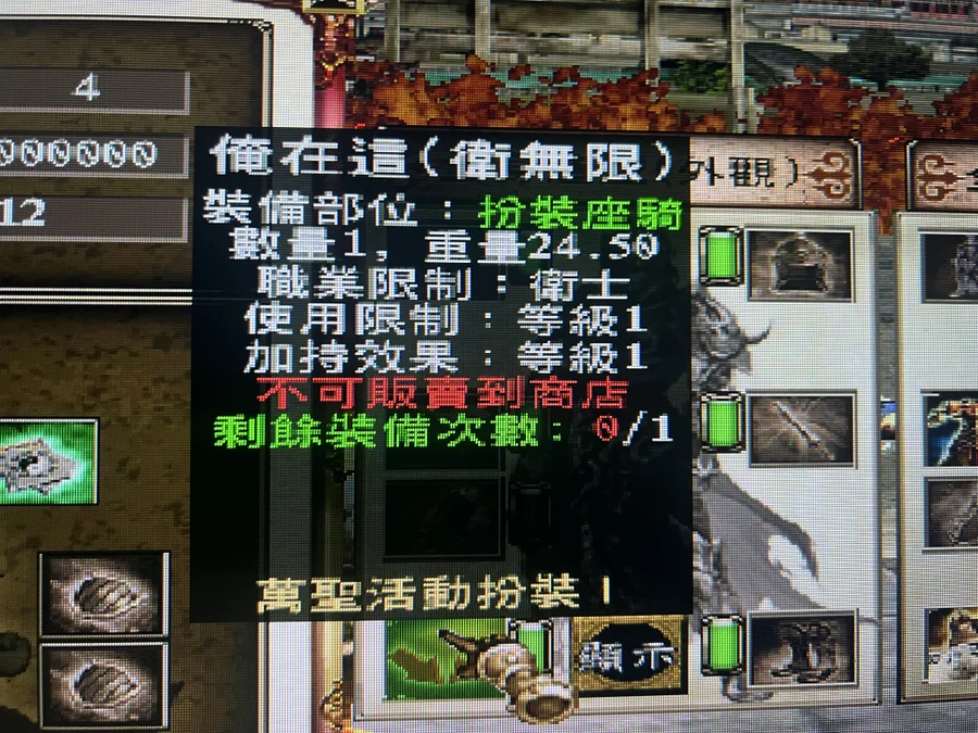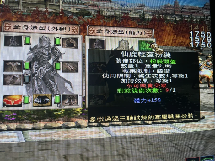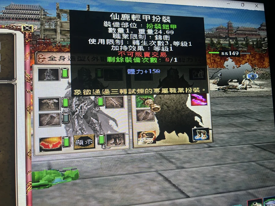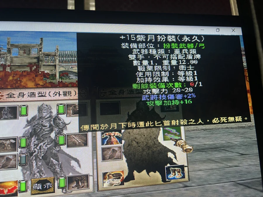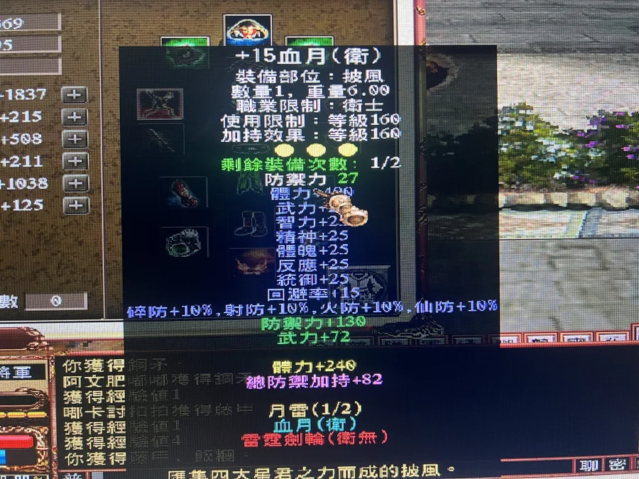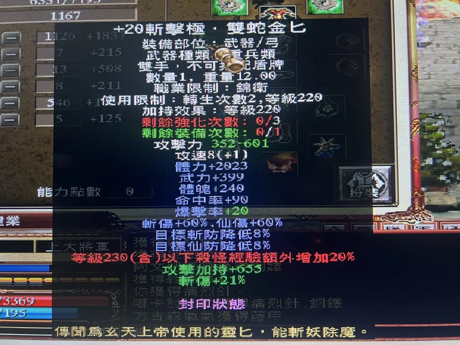 250等 錦衛 15怒 +20 230等重兵 全套230等資訊裝 +17體魄炎翼坐騎 +15血月皮風 +15封斬秘製星巖護腕強五 讓目標斬防降低65% 兩個武力八門守護裝飾品 遊戲幣4.3E元