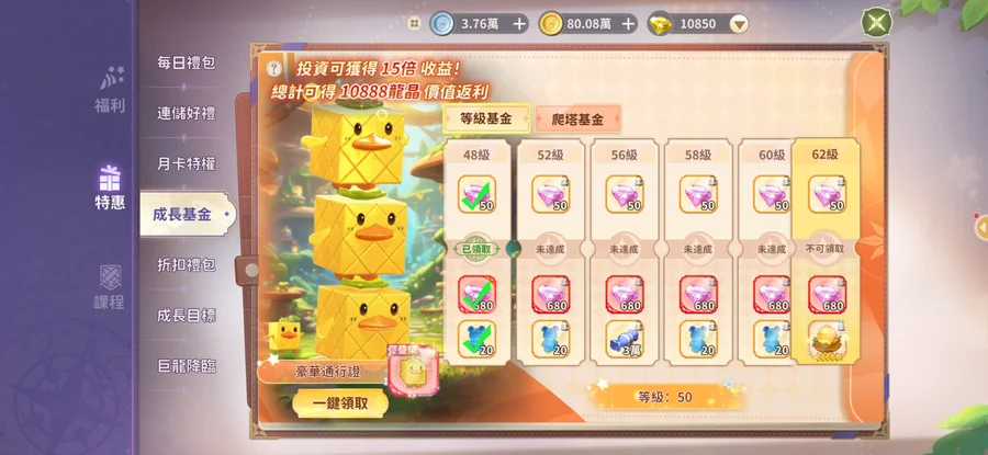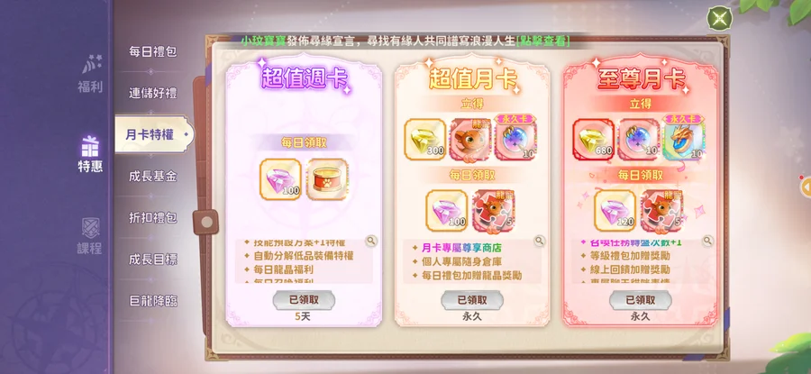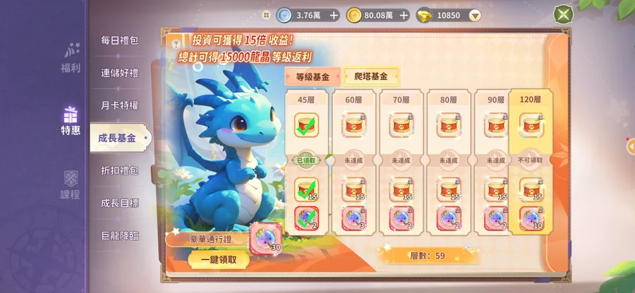 重要商品都有買:月卡 (永久)、基金(等級及爬塔,龍晶還有一萬多