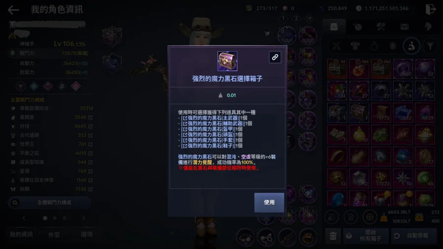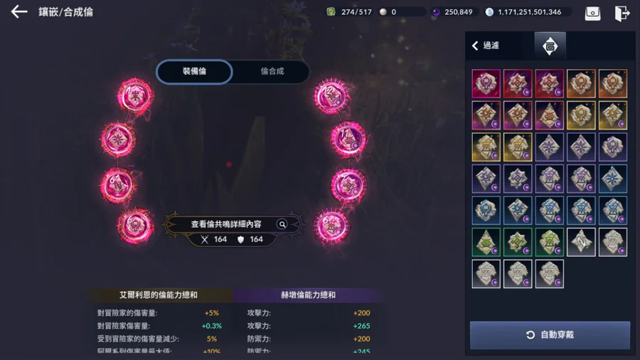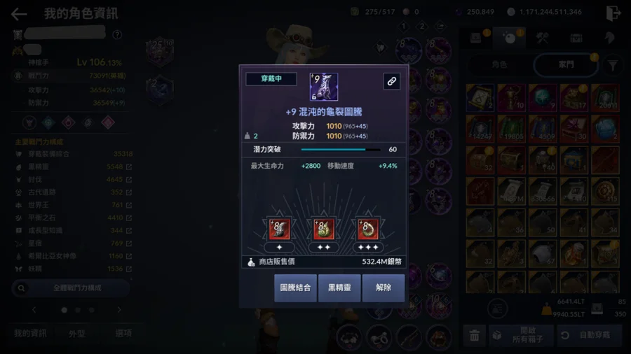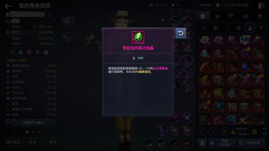 ●主角色武防裝備--- +8混沌主武器 / +8黎明輔助武器(空虛階級) / +8黎明頭盔(空虛階級) / +8黎明盔甲(空虛階級) / +8黎明鞋子(空虛階級) / +8黎明手套(空虛階級)(全太古記憶刻印 / 鑲嵌混沌水晶x29+空虛水晶x1 / 全魔力刻印滿,全+100攻擊/+100防禦_頂),+8空虛項鍊(已覺醒) / +8空虛戒指(已覺醒) / +8空虛耳環(已覺醒) / +8空虛腰帶(已覺醒) / +8空虛手鐲(已覺醒)(全太古記憶刻印 / 鑲嵌精緻的混沌水晶x14+空虛水晶x1 / 各部位飾品之魔力刻印_全+100攻擊/+100防禦_頂),黑精靈倫(全太古黑精靈倫, +12武力之倫 / +11鐵甲之倫 / +7能量之倫 / +6經驗之倫 / +1戰爭之倫 / 意志之倫 / +6阿爾之倫 / 同+6行之倫 ,套用第15個倫共鳴_頂),+19協調的煉金石(鑲嵌+10混沌煉金石:突破 & +10混沌煉金石:幸運 & +9混沌煉金石:激烈 & +9混沌煉金石:勇猛,仍保留大量資源給您自由彈性選擇要衝的煉金石),+10空虛拉夫利普文物 & +10空虛阿爾文物(全太古以上紋樣,其中鑲嵌 2張燦爛太古紋樣刻印書 + 2張太古紋樣刻印書 + 2張 混沌紋樣刻印書_+133頂攻/+71頂防 & 4張混沌紋樣刻印書 ; 系列突破分別為+6/+6),+25空虛的徽章,混沌光源石 (四種分別突破數值如圖所示;+14太古光源石=+0混沌光源石;+15太古光源石=+2混沌光源石;+16太古光源石=+4混沌光源石;製作介面可察看轉換,+15以上光源石才建議太古升為混沌,因可開箱取得),+2傳承之環 (混沌等級),+9渾沌的龜裂圖騰 (結合1個+8圖騰/2個+7圖騰),+9夜幕靈魂石/+6月光靈魂石