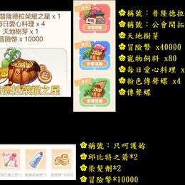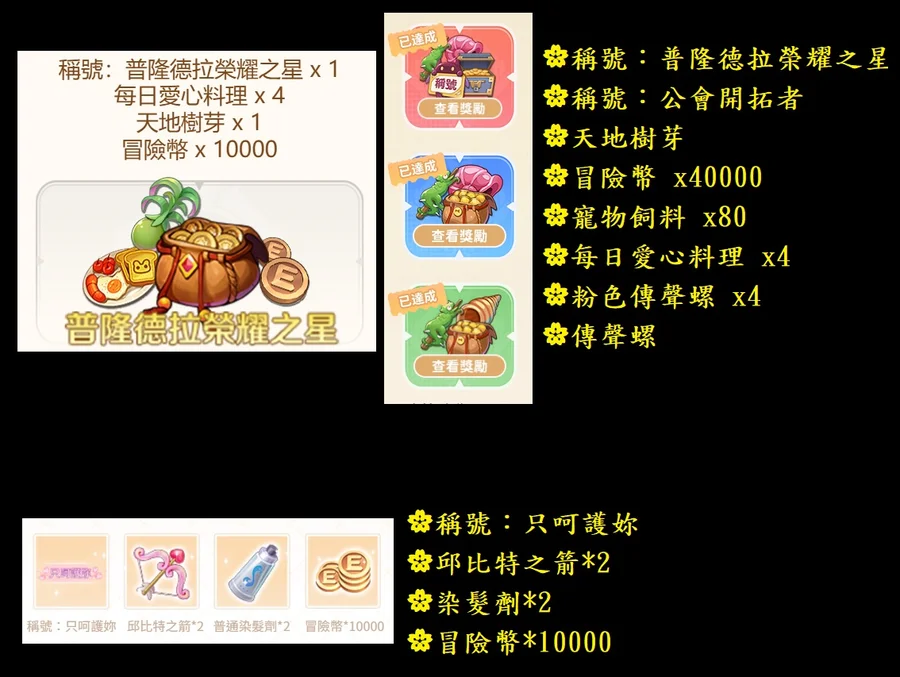 事前預約序號:稱號-普隆德拉榮耀之星+公會開拓者+只呵護妳+轉蛋稱號+卡普拉盲盒
