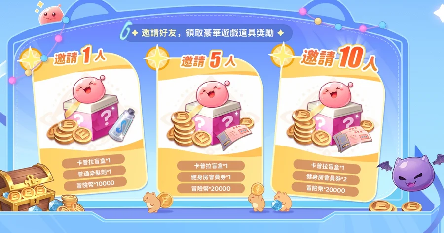 卡普拉盲盒*3+健身房會員券*3+冒險幣5萬+普通染髮劑*1