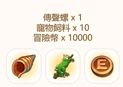 傳聲螺、寵物飼料 x10、冒險幣 x10000