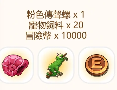粉色傳聲螺、寵物飼料 x20、冒險幣 x10000