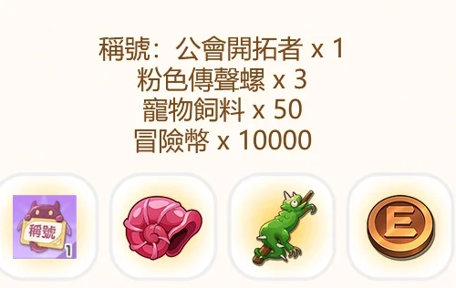 稱號:公會開拓者、粉色傳聲螺 x3、寵物飼料 x50、冒險幣 x10000