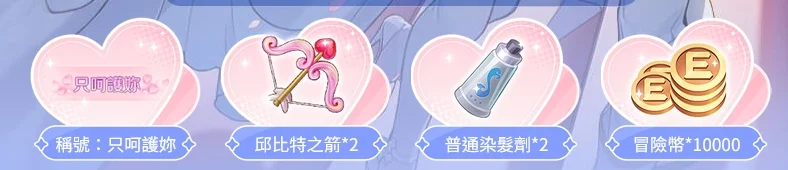 稱號:只呵護妳+邱比特之箭*2+普通染髮劑*2+冒險幣1萬