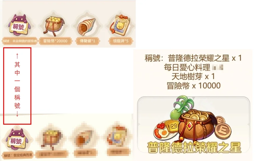 稱號:普隆德拉榮耀之星、每日愛心料理 、天地樹芽、冒險幣 x10000
