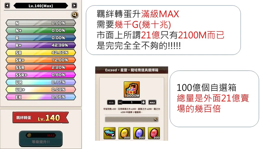 (因市面上所有賣場皆只能提供到21億的數量,這數量是絕對不夠把羈絆抽獎等級以及卡片經驗等級升滿)