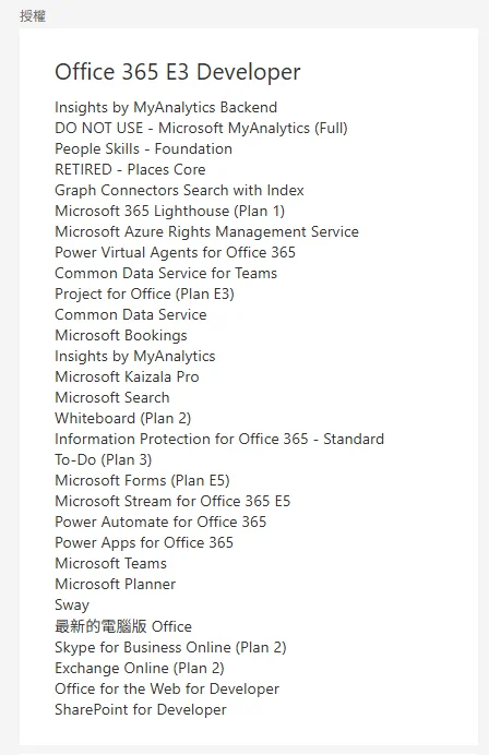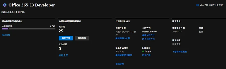 您購買的是 Microsoft 365 E3 開發者帳號(子帳號),提供完整功能,適合開發及測試使用。