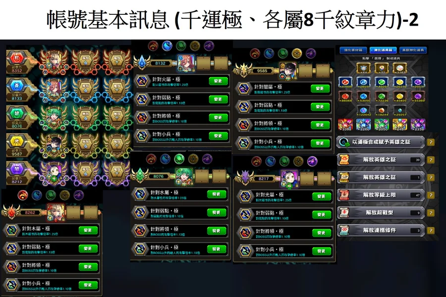 1:運極|極運數,紋章力數、獸神玉、大獸石、各屬性等素材需要花費很多時間,其中運極運數和紋章力數是怪物彈珠最難升級部分(作業感最重的)。此帳號各屬性素材一定數量並千極運數,高紋章力,可節省大量時間直接享受遊戲。