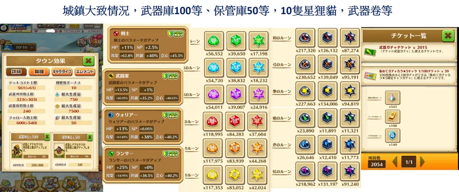 1: 星狸貓10隻 、 武器庫(100等) 、 備武器庫(50等),有一定數量素材。