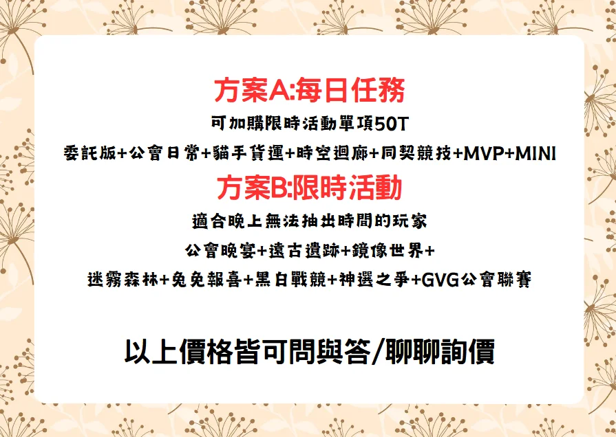 方案A:(每日任務)可+購限時活動單50T