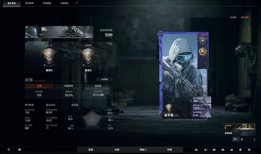 🌟暗區pc 倉值55m 純幣40m 蝴蝶刀全套 3×3已解完 含初使退坑售